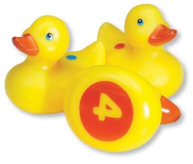 Each duck is designed to be counted, with a number on the underside and dots corresponding to that number on its back. Ducks with odd numbers have blue numbers, while ducks with even numbers have red, making for the perfect introduction to early sorting skills and basic math concepts. Made for play in the water, these ducks are designed with colorful plastic that is mold-resistant. Measure 3 L x 2-1/2 W inches. For ages 18 months and up.Features