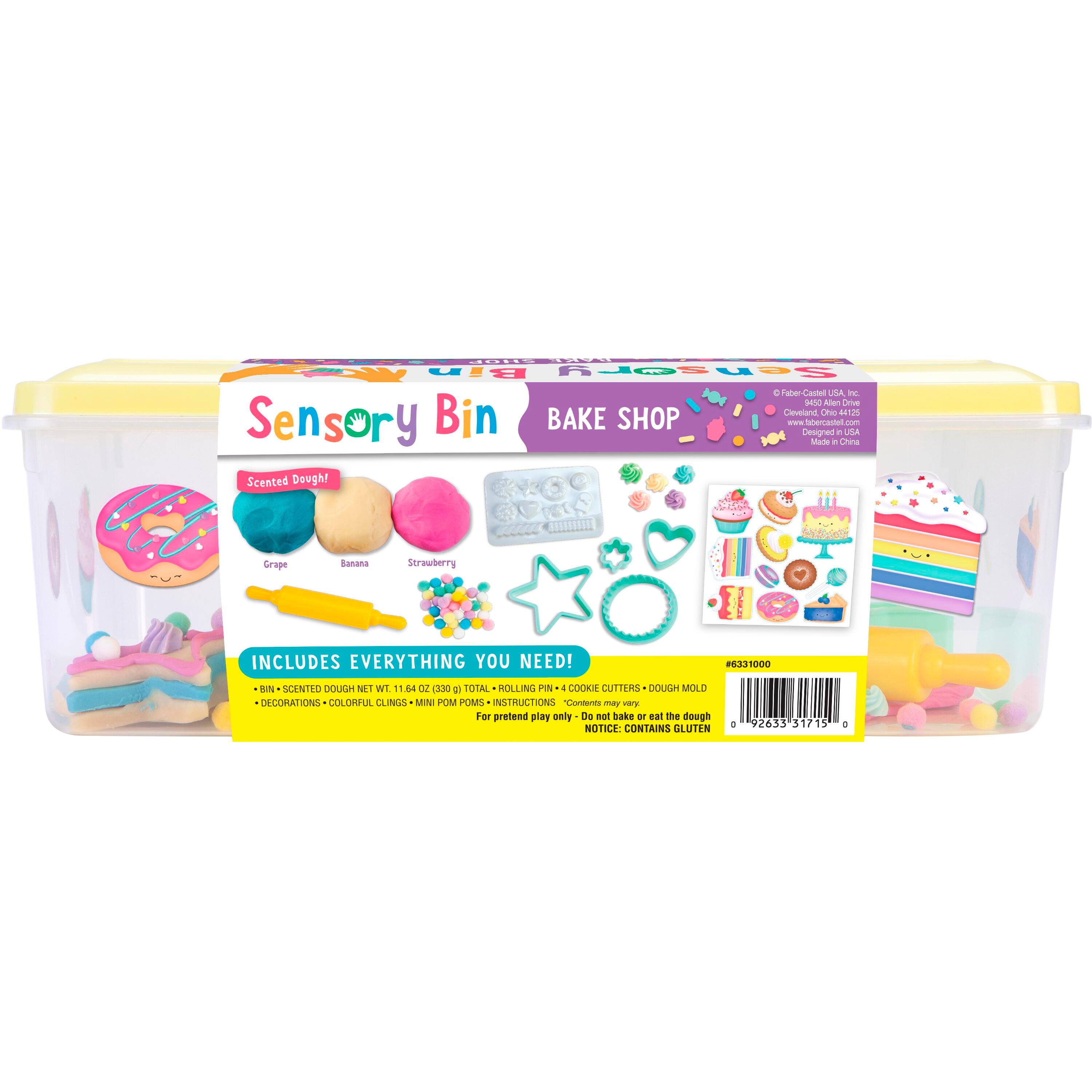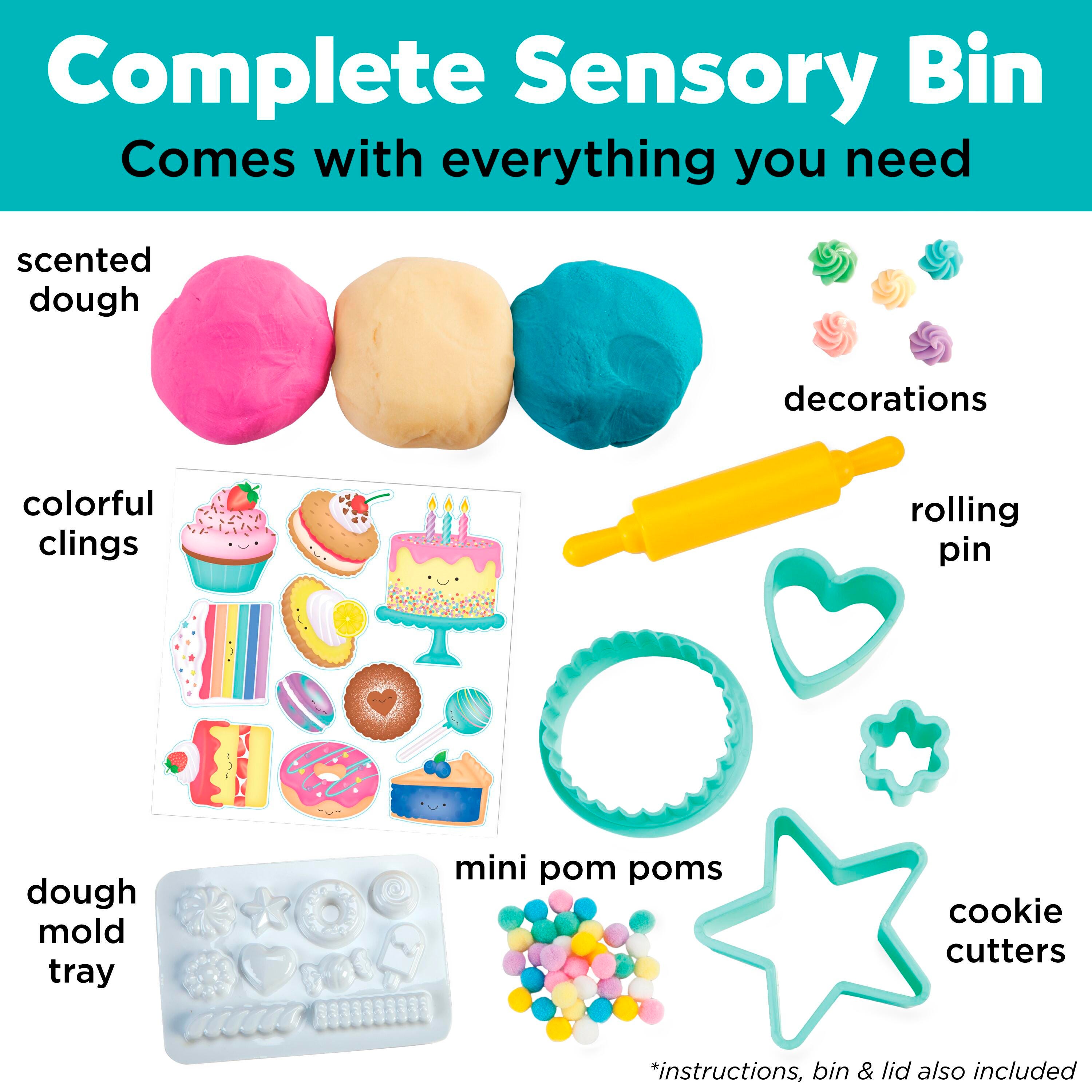Sensory Bins allow children to explore, learn, and create while engaging their senses and having fun! There are endless hours of imaginative play in every kit! Encourage young students to create, decorate, and play with pretend treats in the self-contained sensory bin. The Bake Shop includes 3 scented squishy doughs (strawberry, banana, and grape), cookie cutters, a rolling pin, sprinkles, frosting dollops, a candy mold, and super-sweet sticker clings. Small parts choking hazard, not intended for children under 3. Contents may vary.Features