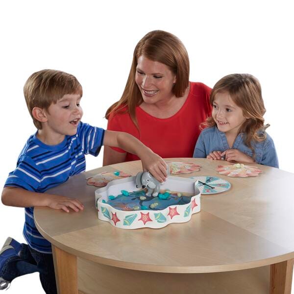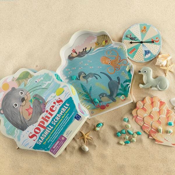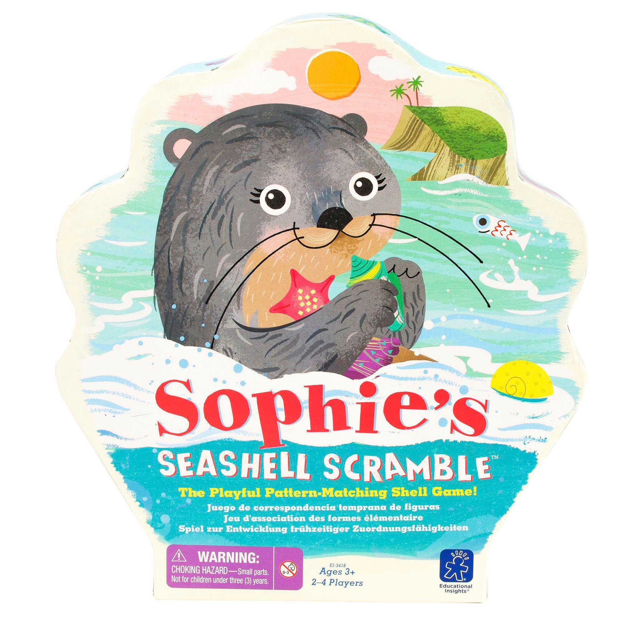 In the Educational Insights Sophie's Seashell Scramble game players spin the spinner and use the Sophie squeezer to pick up a shell with a matching pattern. The first player to collect one shell of each pattern wins! Develops critical pre-reading and strategic thinking skills, enhances fine motor skills and hand-eye coordination, promotes sharing and turn taking, and helps develop social skills. Board game is designed to teach patterns and pre-reading skills. Quick, fun game that children can grasp quickly. No reading skills required. Easy setup and cleanup. Based on the award-winning The Sneaky, Snacky Squirrel Game.