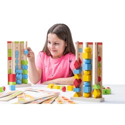 These Shape and Color Sequencing Towers from Educational Advantage offer a hands-on activity to learn shapes, colors, and patterns. This set uses plywood sequence cards that slip into the back of the base and feature different sequence puzzles for children to solve. Children complete these sequences by stacking the corresponding shape pieces on the poles attached to the base, and using deductive reasoning to identify the missing shape(s). There are 2 levels of color-coded learning, with the green level being basic sequences with 1 space to fill, and red level being more complicated sequences with 2 spaces to fill. This set contains 112 pieces total, with 92 shape pieces, 2 bases, 6 poles, and 12 plywood sequence cards. Recommended for ages 3 and up.Features