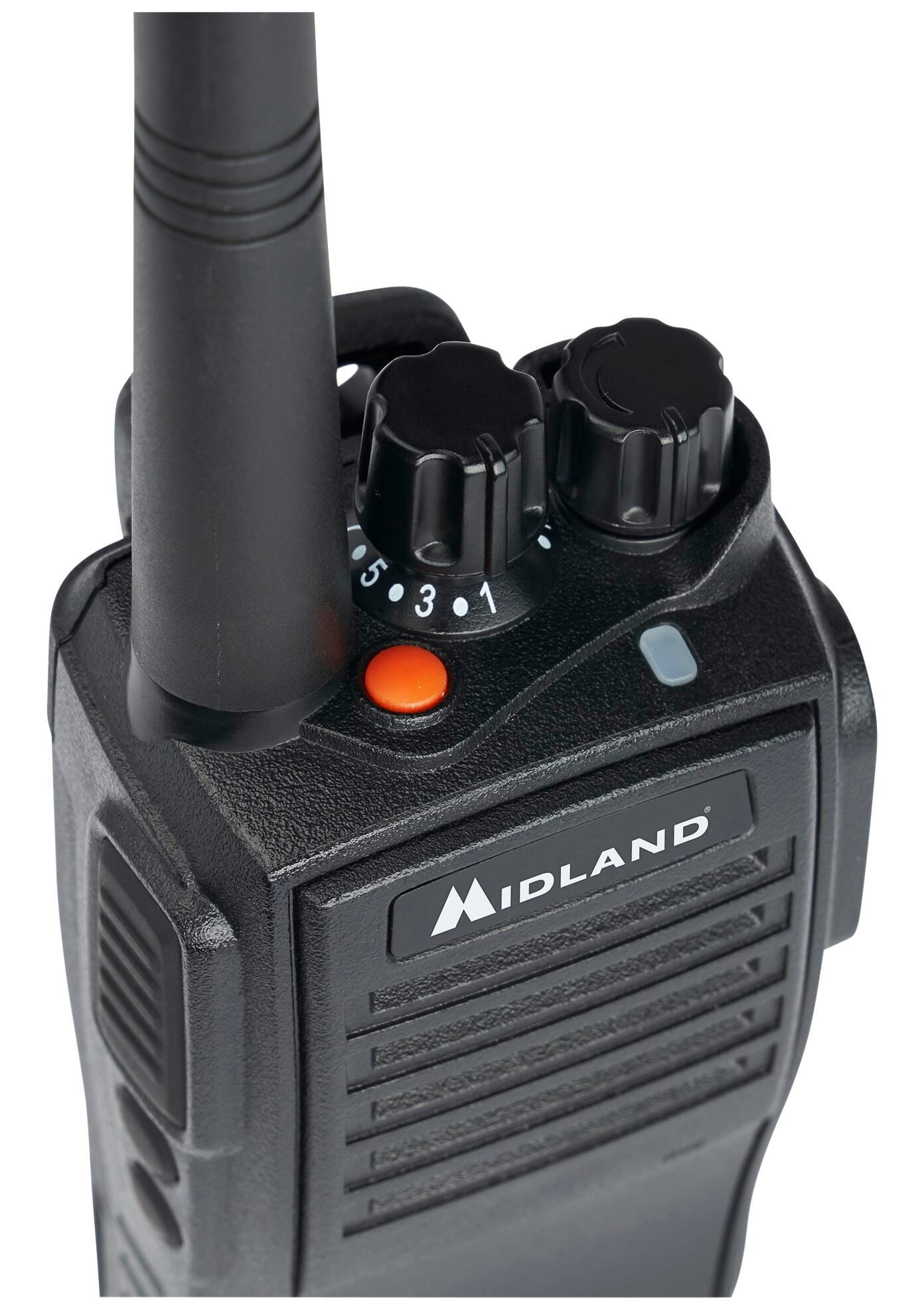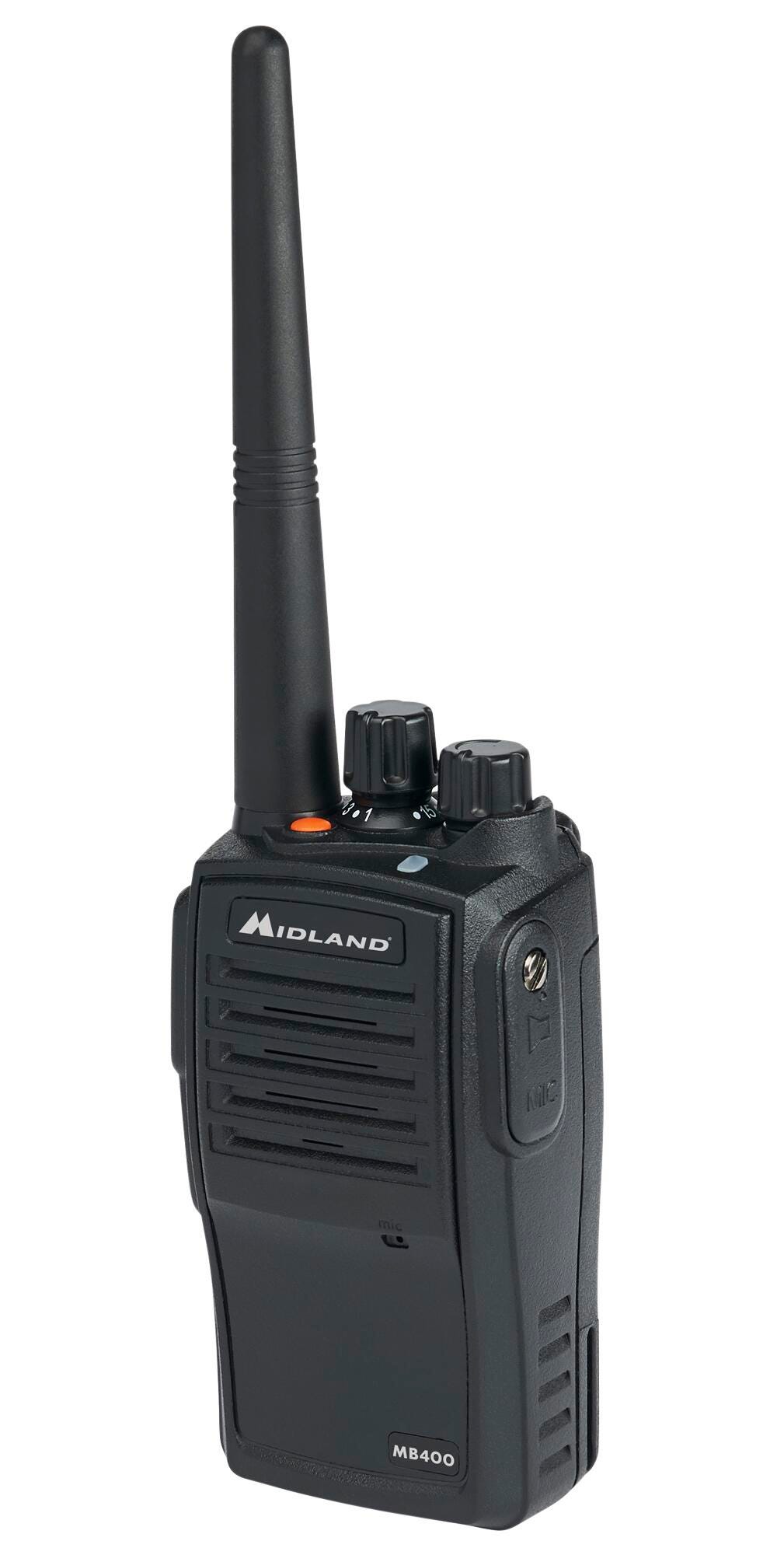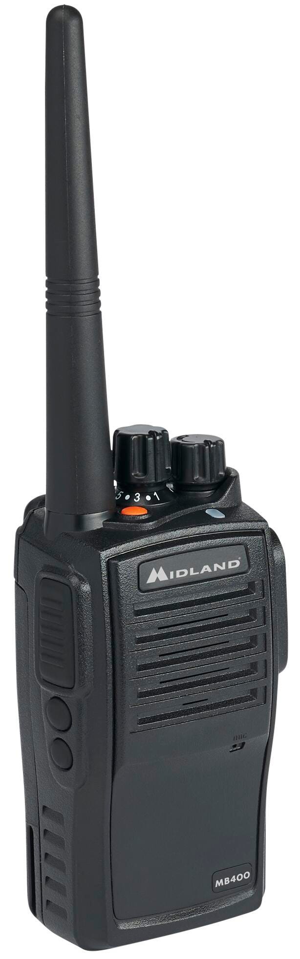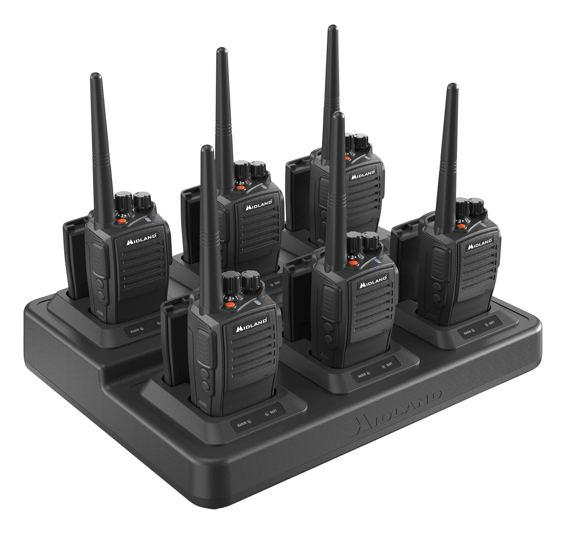 Easily connect your team with the Midland BizTalk MB400 Business Radio Bundle. The MB400X6MC comes complete with six IP67 waterproof industrial grade MB400 business radios, batteries, antennas, and belt clips along with an MGC400 Multi-Unit charger that charges all 6 radios from a single outlet. Pre-programmed right out of the box with 16 business band channels or can be custom programmed using the programming software and separately purchased programming cable.Features
