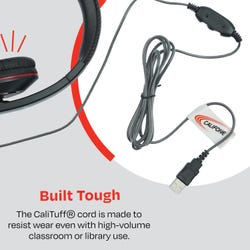 Califone 2021 Stereo Headset with Ambidextrous Gooseneck Microphone is perfect for in-class language learning, virtual lessons, and more. Whether in the classroom or at home, the headphones provide a lightweight, comfortable, and durable design. The adjustable padded headband allows for extended wear, and the earphones have cobalt transducers to perform with surround sound quality. Changing the sound level is easy with an inline volume control located on the cable. Made for all ages, the highly durable CaliTuff cord is made of braided, PVC-jacketed material with a reinforced earcup entry point. It resists bending, cutting, and separation due to heavy use, chewing, or rough play. The long 6-foot cord has a USB plug and is compatible with Chromebooks, laptops, desktops, PCs, and Macs. These headphones with a gooseneck microphone are backed by a 3-year warranty.Features