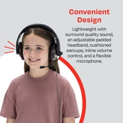 Amp up learning and fun using this headset with flexible mic, surround sound quality, and on-cable volume control. Connects to your device using a USB plug.