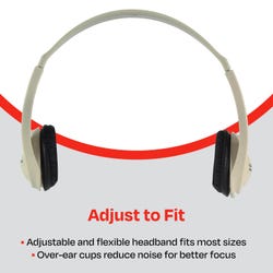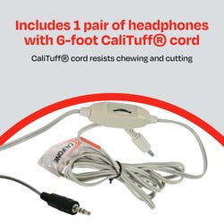 Califone's classic durable yet lightweight design is perfect for developing critical language learning skills and listening skills with clear audio and noise-reducing capabilities. They're lightweight and adjustable to fit older children or adults. Designed for long-term use, changing out ear pads on the over-ear cups is simple. Permanently attached, 6-foot CaliTuff® cord resists tangling with other cords and is long enough to reach ports located at the rear of the computer. Cord has convenient inline volume control and a 3.5mm stereo plug compatible with both Mac and Windows devices. Comes in beige. Covered by a 90-day warranty.Features