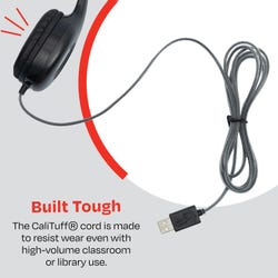 Califone KH-08 USB BK On-Ear Headphones are perfect for classrooms, libraries, listening centers, and more. Made for all ages, the lightweight headphones feature a highly durable CaliTuff cord made of braided, PVC-jacketed material with a reinforced earcup entry point. It resists bending, cutting, and separation due to heavy use, chewing, or rough play. The long 6-foot cord has a USB plug for compatibility with Chromebooks, laptops, desktops, PCs, Windows, and Macs. These black on-ear headphones are backed by a 3-year warranty.Features
