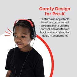 Equip young students with these black and red children's headphones with inline volume control for convenient listening and learning in the classroom.