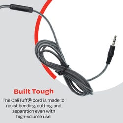 • A highly durable CaliTuff cord on these headphones for children features a braided, PVC-jacketed material with a reinforced earcup entry point to resist bending, cutting, and separation