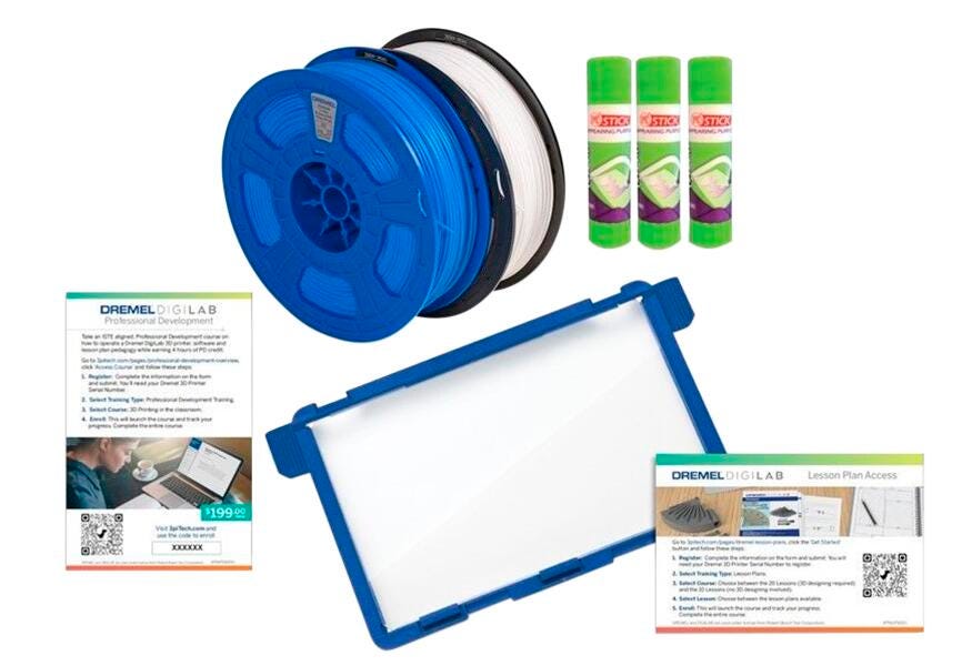 The award-winning Dremel DigiLab 3D45 3D Printer plus 30 standard-aligned lesson plans. 20 Lessons (3rd – 12th grades) incorporate design thinking through a design challenge. Students gain experience with the entire 3D printing process: designing with Auto-desk software, 3D printing, testing and learning, and re-designing if needed to achieve the desired outcome and pass the lesson. 10 Lessons (6th – 12th grades) offer an easy to follow lesson with no need for 3D design software skills. These lessons are for first time users and can be implemented immediately. Also included is an online, self-paced training with 4PD credit hours. Through this training course you will get experience using software and hardware to design and print real objects using your Dremel 3D printer. Furthermore, the kit includes additional filament and supplies. Get more of the consumable materials you will need to keep your students printing and learning. Packed with 4 total spools of filament and 5 glue sticks, the EDU kit has at least twice the supplies versus the basic printer kit.Features