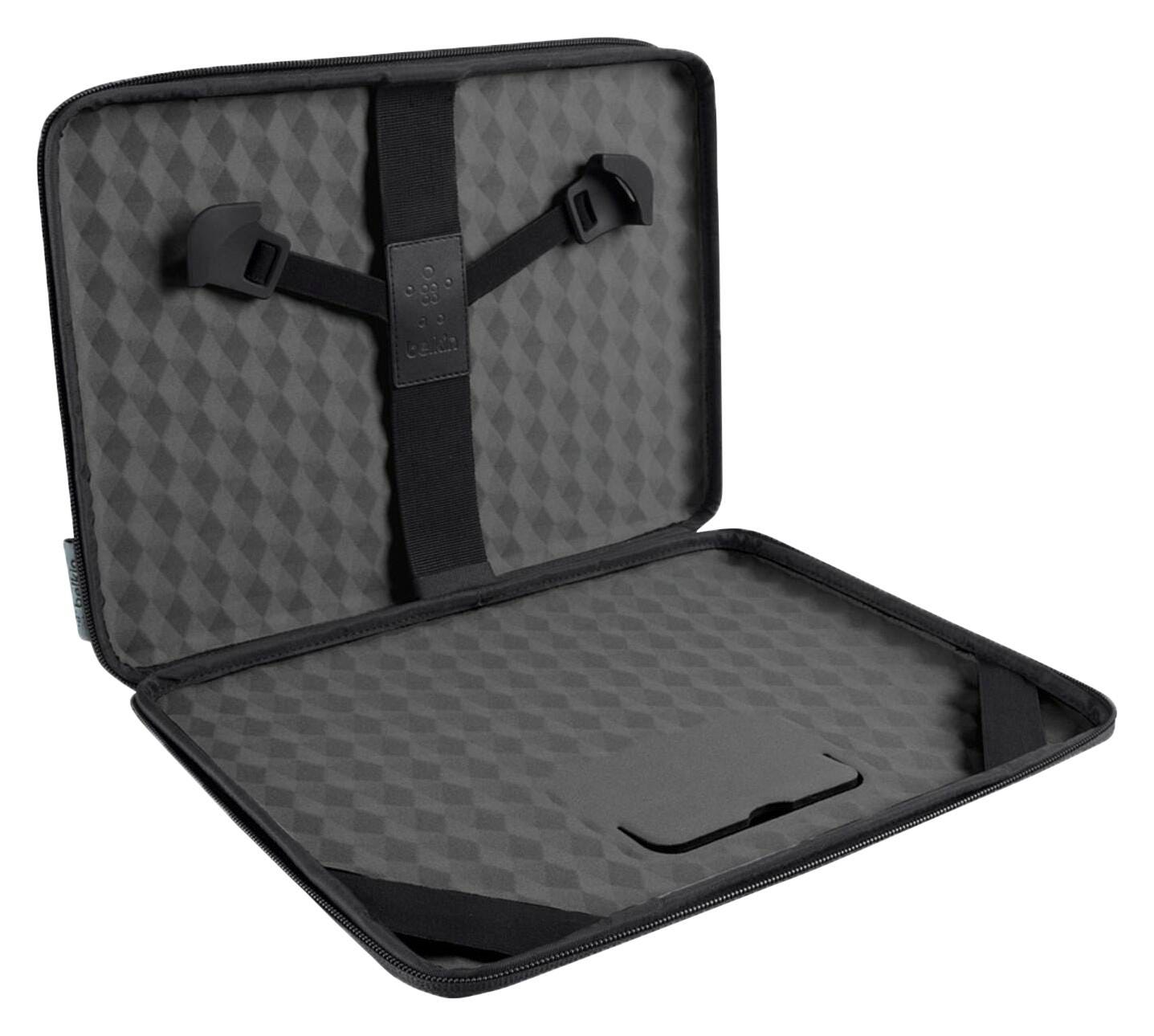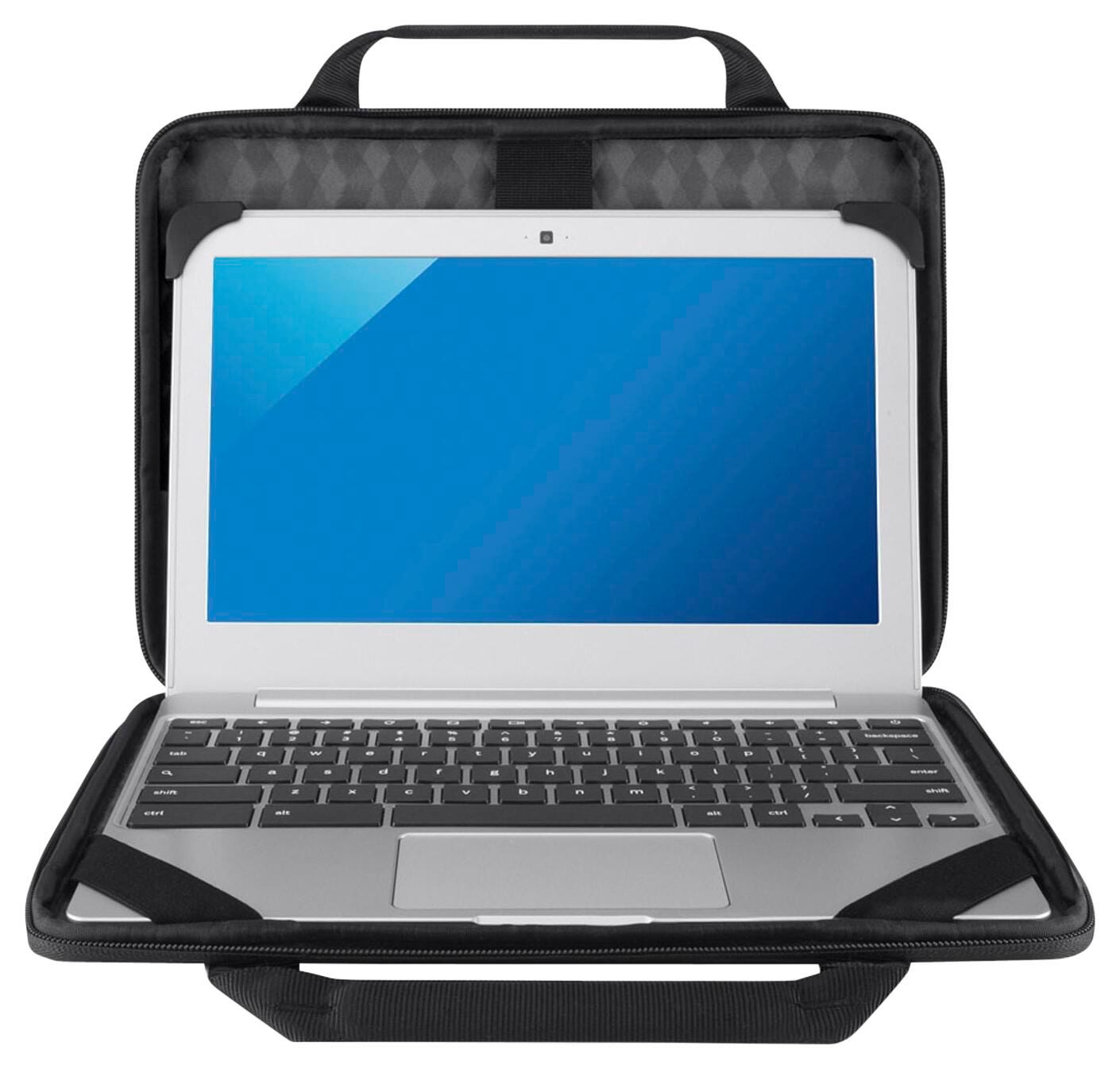 The Belkin Air Protect Always On Case has a durable exterior that protects 11 inch laptops and Chromebooks from heavy wear and tear, making it perfect for classrooms. Shock absorbing padding on all six sides safeguards the device against accidental damage from drops and dings. Use the integrated carrying handle or slip the lightweight case inside a backpack for easy portability. A convenient bottom pocket safely stores a charger and other accessories without damaging the device. The sleeve fits most 11 inch laptops and Chromebooks up to 12.2 in x 8.75 in x 1.1 in.Features