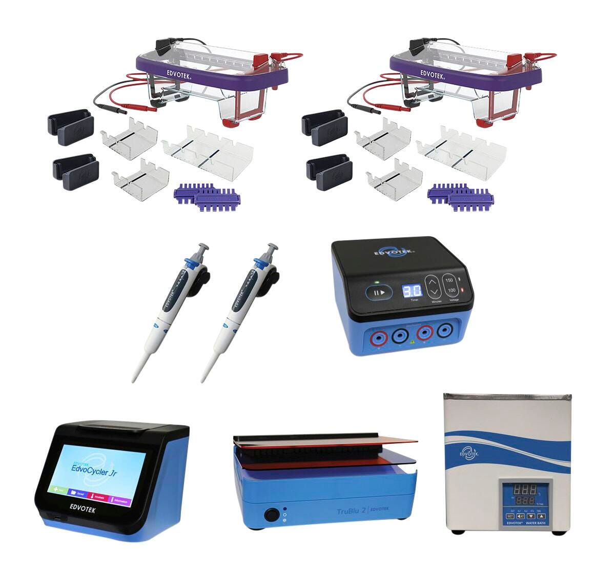 The Personal PCR LabStation provides the right lab tools you need to ensure that you get the most accurate results in bacteria detection. In this lab station, you will receive the EdvoCycler Jr. (16 x 0.2ml), 2 x M12 Complete Package, 1 x DuoSource Power Supply (100 or 150 V for 1 or 2 Gel Chambers), 2 x Variable MicroPipette (5-50 µl), 1 x TruBlu™ 2 Blue/White Light Transilluminator, and a 3 Liter Water Bath.- Instructions