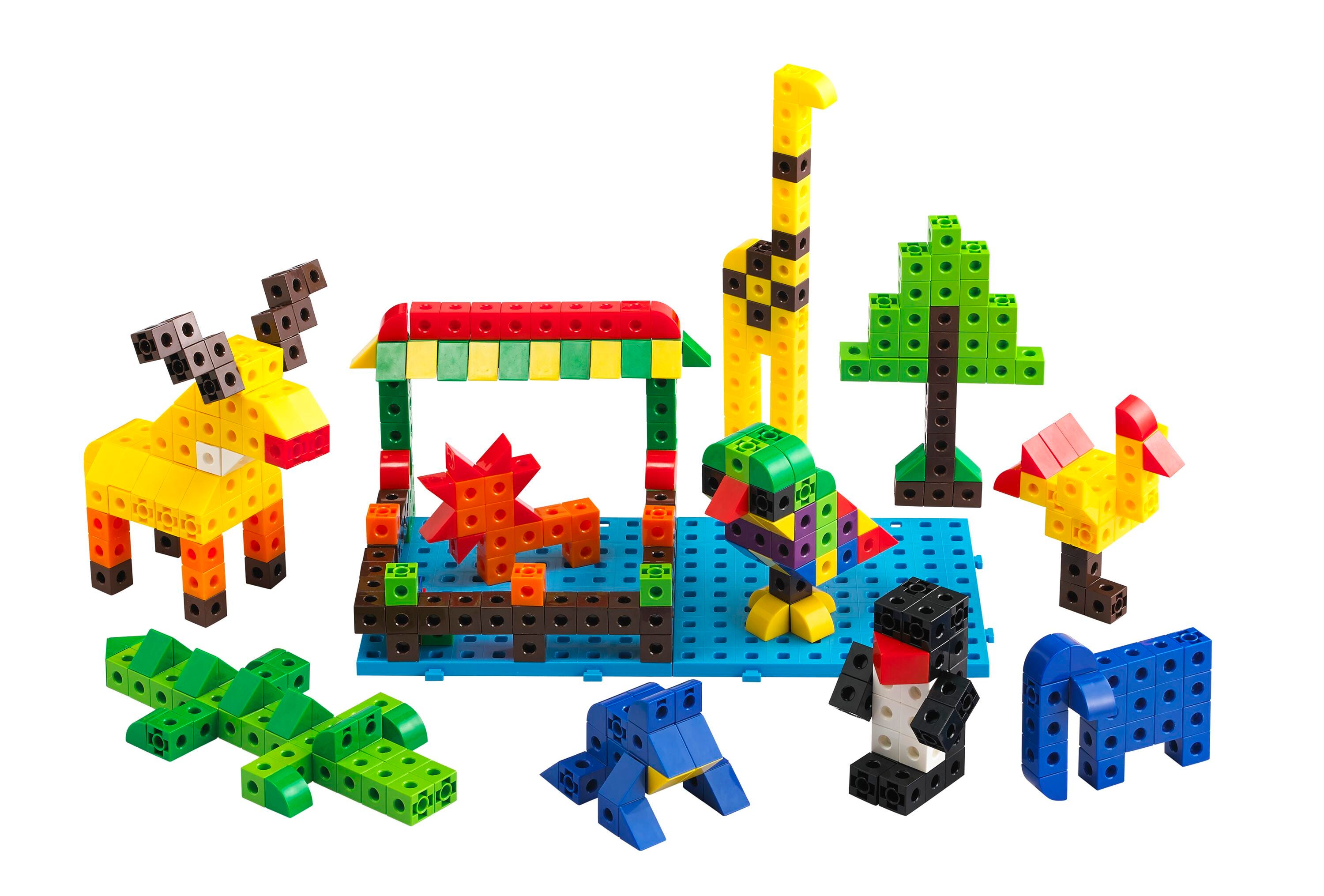 The creative possibilities are endless with these cubes! Designed to be virtually unbreakable, and will meet any rigors play time. Set includes 10 bright colors, comprising 400 cubes, 50 triangles, 50 quadrants, 4 base boards, and 36 double sided activity cards. Everything can be storage in the storage container that comes along with the product. Cube measures 2 cm square.Features