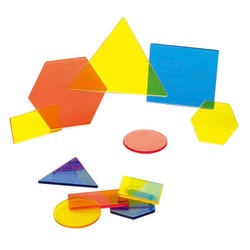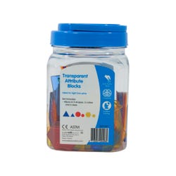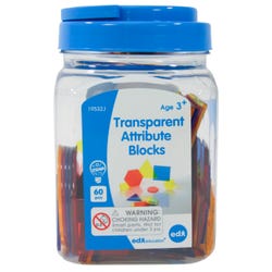 Edx Education Transparent Attribute Blocks are ideal for light box play, in which children can explore colors as the light goes through the transparent shapes. These blocks are perfect for teaching basic math concepts and 2D geometric shapes. Transparent blocks come in three colors: red, blue, and yellow. Sizes range from 1-3/4" through 3" in circles, squares, triangles, rectangles, and hexagons. Ages 3+Features