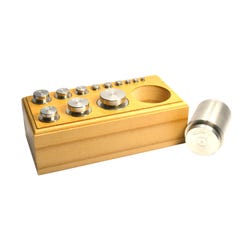 Stainless steel balance weights come with a beautiful, premium wooden block for storage and display. Set of 13 weights have maximum weight capacity of 2000 grams (or g), which is approximately 4-2/5 pounds. Pieces include the following weights and quantities: (1) 1000 g, (1) 500 g, (1) 200 g, (2) 100 g, (10 50 g, (1) 20 g, (2) 10 g, and (1) 5 g, (2) 2 g, and (1) 1 gram weights.
