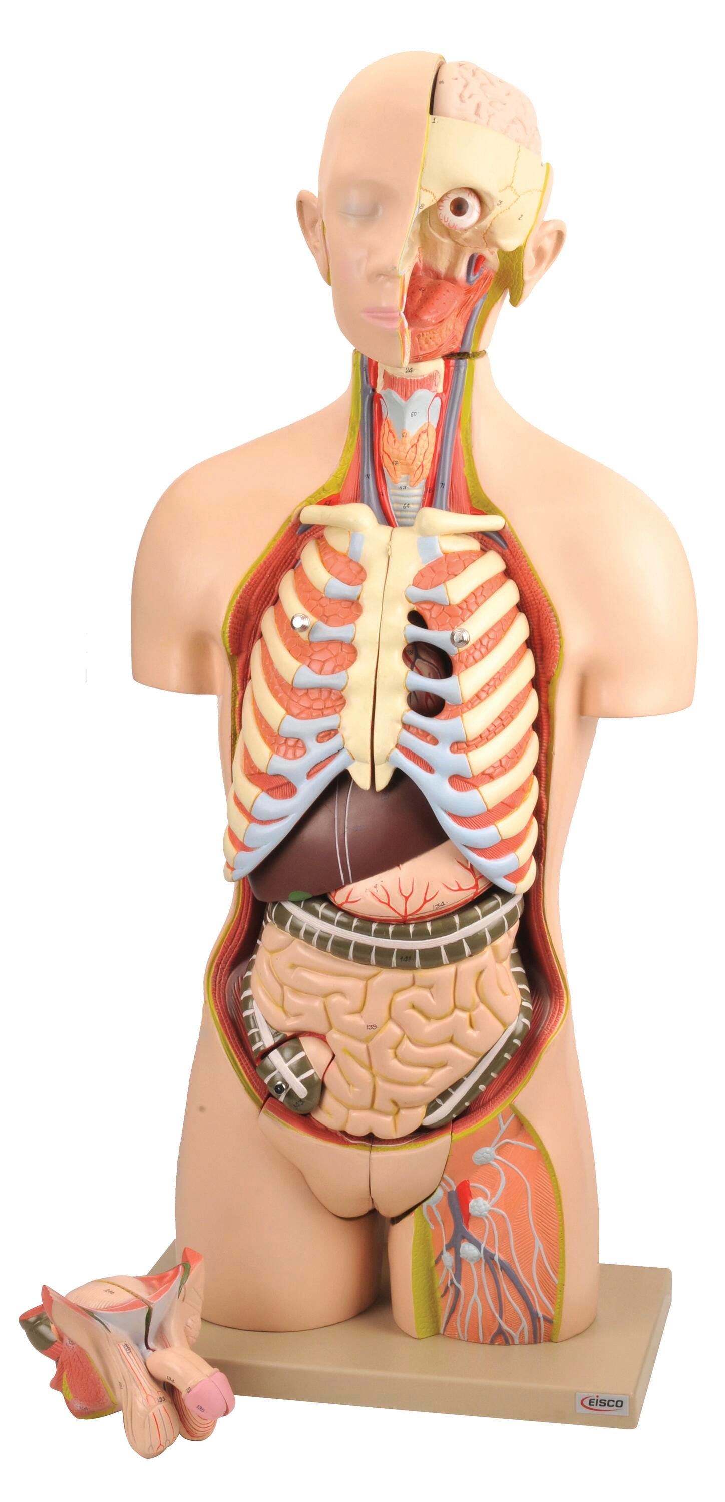 The detailed, life size 3D rendering of the human torso with its vibrantly colored anatomy is ideal for studying the structure and function of the organs of the human body. The back of the torso is sectioned to reveal spinal anatomy. Both male and female sex organs are included for study. Some of the organs are also dissectible for further study (brain, lungs, heart, stomach, intestine, male genital, and female genital). The nasal and buccal cavity, along with an eye, optic nerve, and half of the brain, are all shown. The 1st, 5th, and 7th dorsal vertebrae are removable. The model is extremely detailed and provides an excellent overview of the organs in the human torso. Measures 15.35 x 9.44 x 33.5 inches and weighs approximately 19 pounds.Features