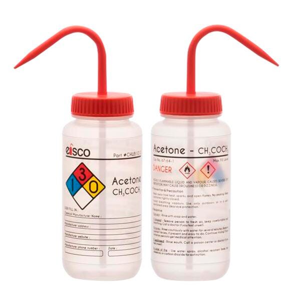 Eisco Labs 500 milliliter acetone wash bottles feature performance plastic with flex ink. Ink won't fade, crack or peel. Each bottle features a two piece construction, consisting of the bottle and leak proof cap with built in nozzle. The low density polyethylene plastic is very responsive, with smooth bounce back that won't get stiff over time. Easy to control squeeze for dispensing.Features