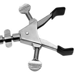 This 2 Prong Double Adjustable Universal Clamp features an integral boss head and non-slip vinyl coated jaws. Has an adjustable length of 7-1/2 to 8 inches and has a width of 4 inches at the thumb screws. Adjustable jaws measure 2 inches long and open to up to 3 inches wide. This clamp with boss head is ideal for use with straight sided glassware apparatus such as tubes, flask necks, and burettes.