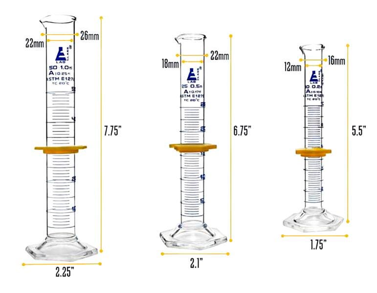 Three piece Measuring Cylinder set made of high quality, heavy duty, borosilicate 3-3/10 glass. 10, 25 and 50 milliliter capacities. Each cylinder features a spout for easy pouring, and hexagonal base for extra stability. Class A tolerance, per ISO/ASTM. All are fitted with a plastic, hexagonal protective collar. Set is packaged in a custom fit, thick foam casing, for safe storage and worry free transport.