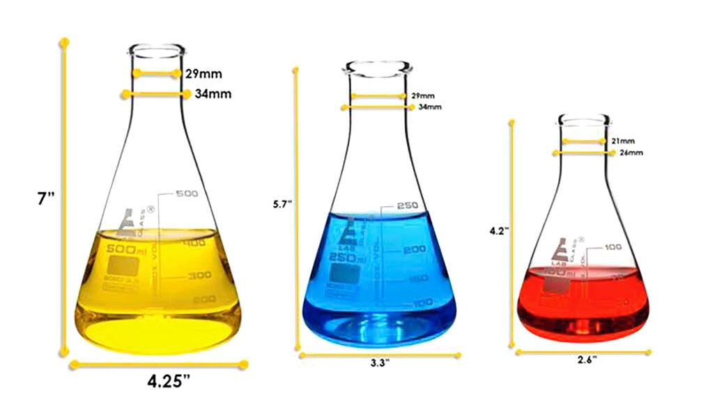 Three-piece Erlenmeyer Flask set made of high quality, heavy duty, borosilicate 3-3/10 glass. Includes three, narrow neck flasks with 100, 250 and 500 milliliter capacities. Flasks feature white, printed graduations, and beaded rims. Uniform, thick walls provide excellent strength against breakage. Set is packaged in a custom fit, thick foam casing, for safe storage and worry free transport.