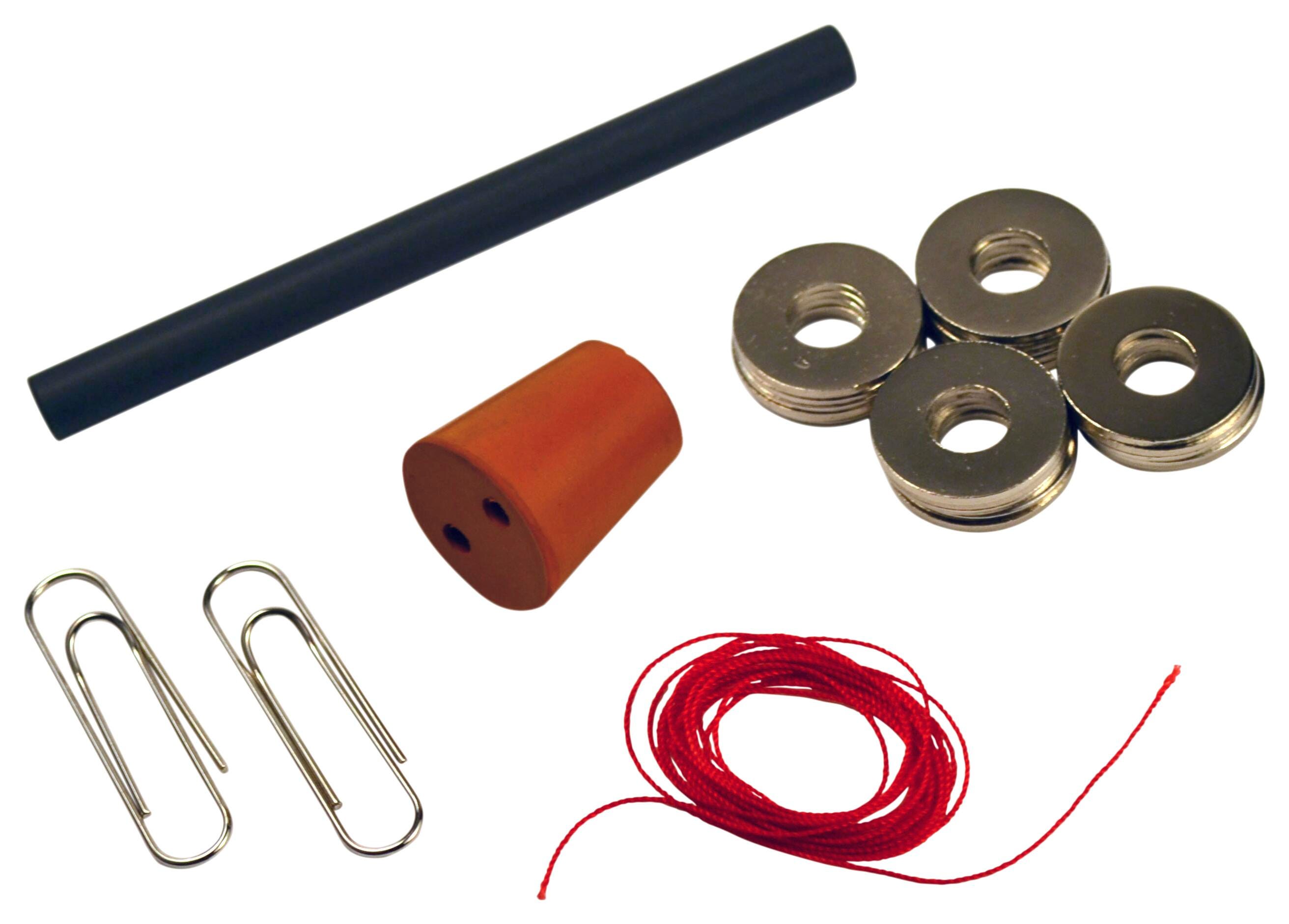 This elegantly simple kit provides the necessary tools to discover properties of rotational dynamics. A rubber stopper swings around on the end of a string counter balanced by weights, allowing students to see how mass and radius affect centripetal acceleration and rotational velocity.Kit Contains:
