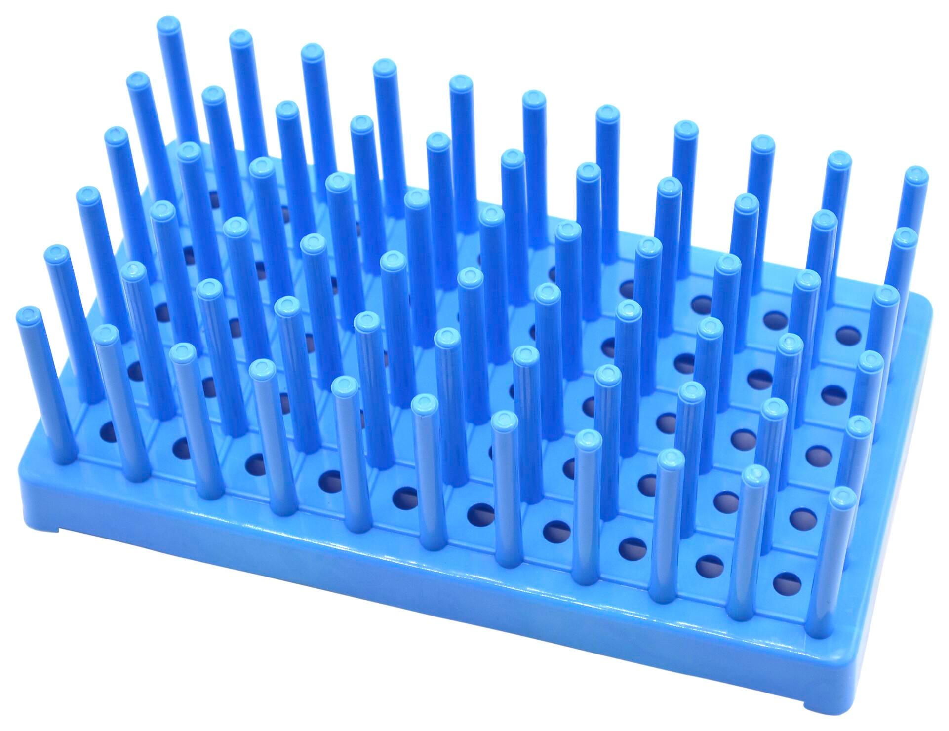 This test tube drying rack has 50 pegs to conveniently hold inverted test tubes (up to 3/5 inch, or 16 millimeters, in size) for drying purposes, as well as to minimize the collection of airborne contaminants. The bottom of the rack has holes to increase air flow. In addition to test tubes, the drying rack can be used to hold and dry electrophoresis and chromatography plates. Fits 50 tubes at 16 millimeter (mm) size. Full blue rack measures approximately 7-2/5 L x 4 W x 2-3/4 H inches.