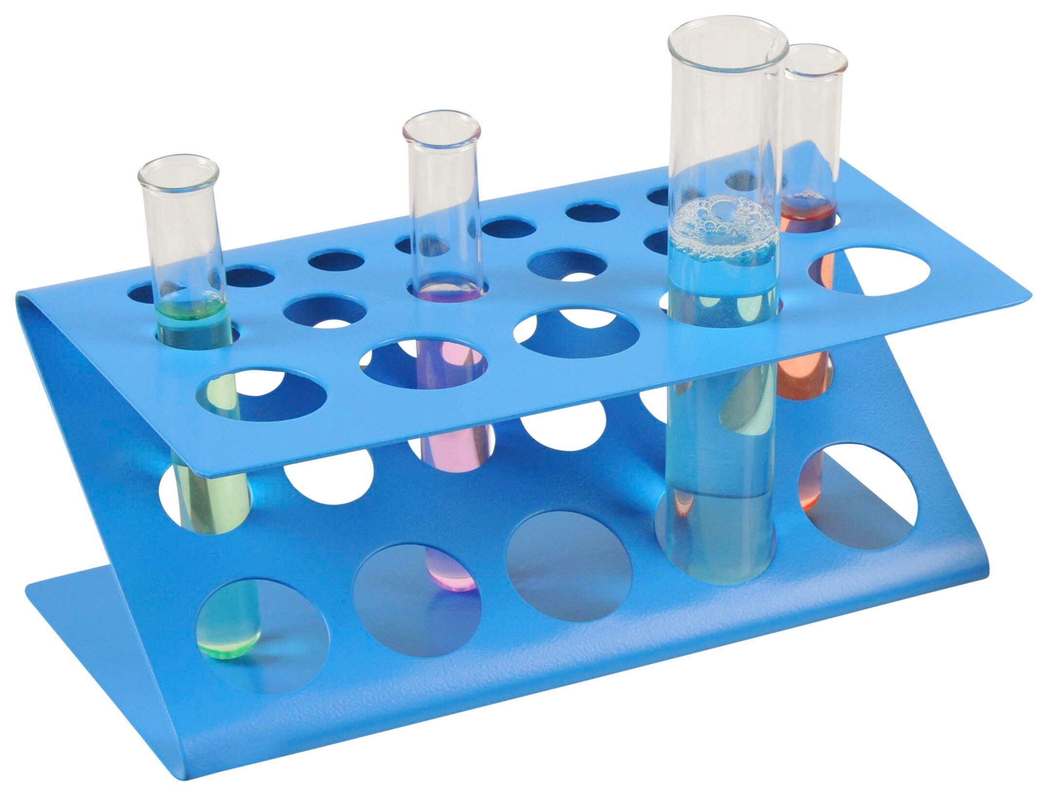 Z Shaped test tube stand fits up to 18 test tubes with its 3-tier design made from anodized, 18 gauge aluminum sheet. The stand features 18 spots for 3 different size test tubes: (6) 1 inch holes, (6) 3/4 inch holes, and (6) 1/2 inch holes. The blue "Z' stand sits 7-8/10 inches (200 millimeters, or mm) tall and 3 inches (75 mm) wide.