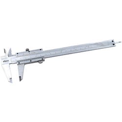This 8 inch Vernier caliper is excellent for providing accurate and precise measurements. It features a dual scale metric and imperial measurements with accuracy up to 0.05 mm and 1/128 inch. It is perfect for measuring the length, inner diameter, and outer diameter of any objects up to 8 inches. This caliper is made from durable carbon steel with long-lasting, laser engraved graduations. Scientific conversions are conveniently provided on the back. The jaws glide smoothly and a locking screw can be used for obtaining measurements. Case is included.