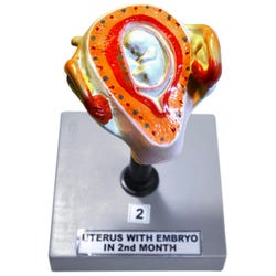 Detailed 3D renderings of the development of the human fetus (in all 8 stages) offer a visual and kinesthetic ideal aid for studying the complete gestation of a human baby from the embryo stage to month 7 (which shows twins). Each stage is clearly labeled and months 4 to 7 have fetuses that are removable to show how the umbilical cord connects them to the mother for nourishment. Each of the 8 stages has a base, stand, and uterus with embryo/fetus. All bases have diameter of 4-9/10 x 4-9/10 x 1 inches.