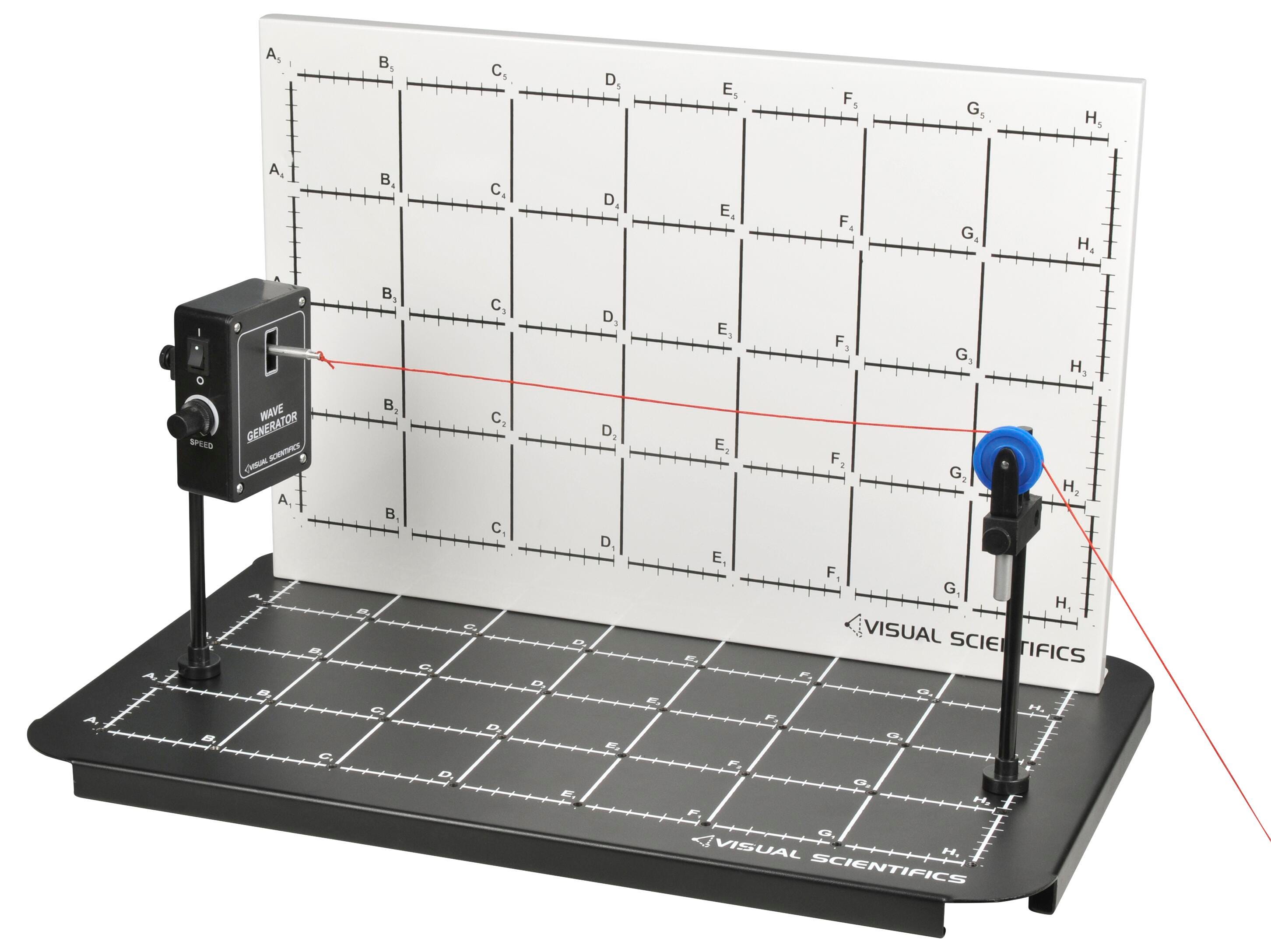 This apparatus is designed to guide students through understanding standing waves, nodes, antinodes, period and frequency. tension. After working through this visual scientifics module students will be able to answer questions such as: How does the tension on the string affect the frequency of the standing wave? How does the length of the string affect the speed of the wave? How does the mass of the string affect the frequency of the standing wave? How does the tension on the string effect the speed of the standing wave? Also comes with a 10 plus page instruction booklet covering approximately 2 to 3 hours of class/lab time material. This kit includes components for the standing wave demonstrator experiment. Useful in helping students understand the physics of wavelengths, and explore wave interferences. Kit includes Wave Generator, mountable pulley and string. The base and back board are sold separately and are required/recommended for the included experiments. Other accessories are required, but not included, can be found in the lab manual. Base and Back sold separately.Features