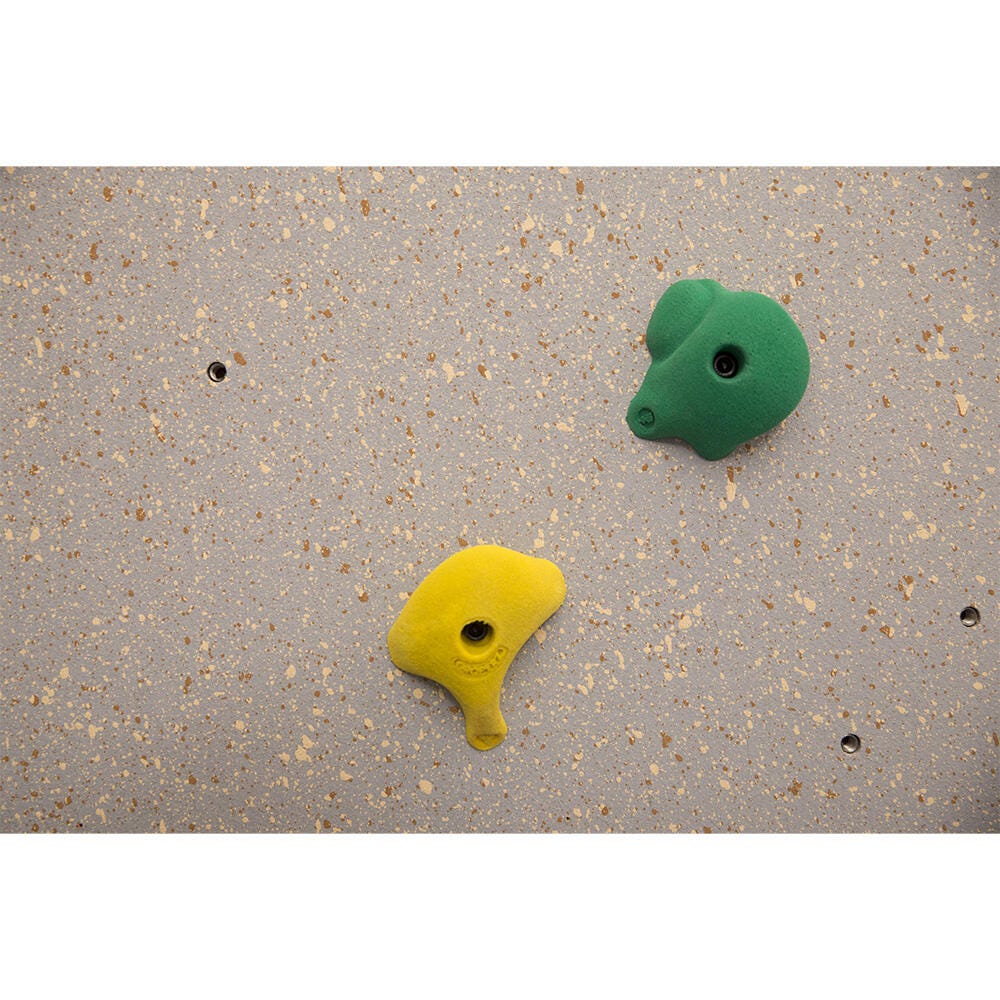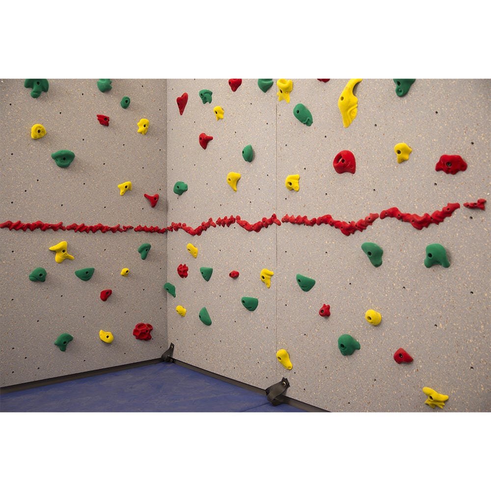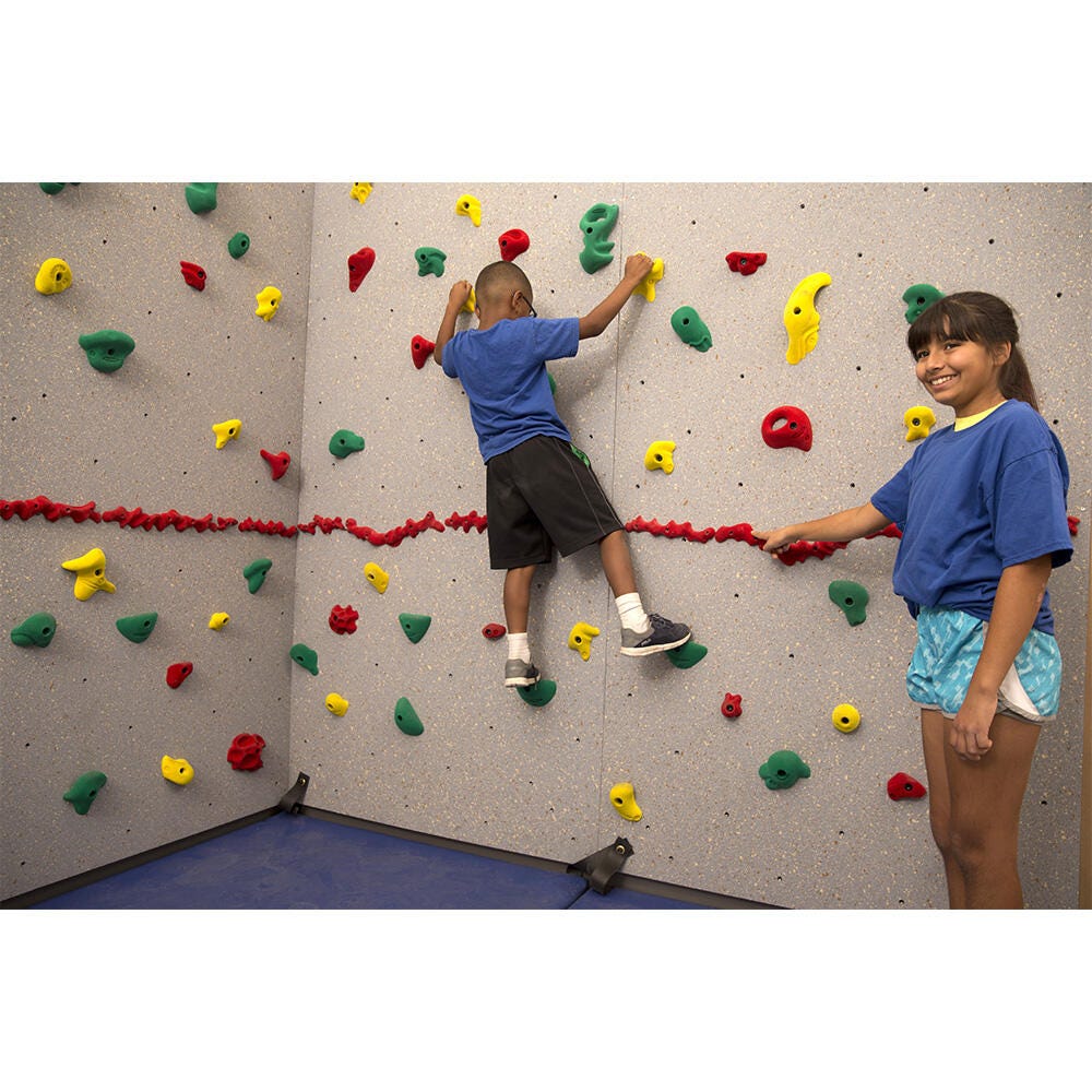 The Standard Climbing Wall features earth tones and a lightly textured surface. The color-coded Groperz Hand Holds offer a variety of options for climbers to use as they climb. Green hand holds are the largest and easiest to grip. The yellow holds come in a variety of sizes and offer a light challenge. The red holds are medium sized and provide the most challenge. Climbers can choose to use any color hand hold, or try the extra challenge of climbing using only hand holds of the same color. The signature Red-Relief Line is a safety feature that reminds climbers to stay within a distance of three feet from the floor and is a helpful tool for the climbing wall supervisor.Includes: