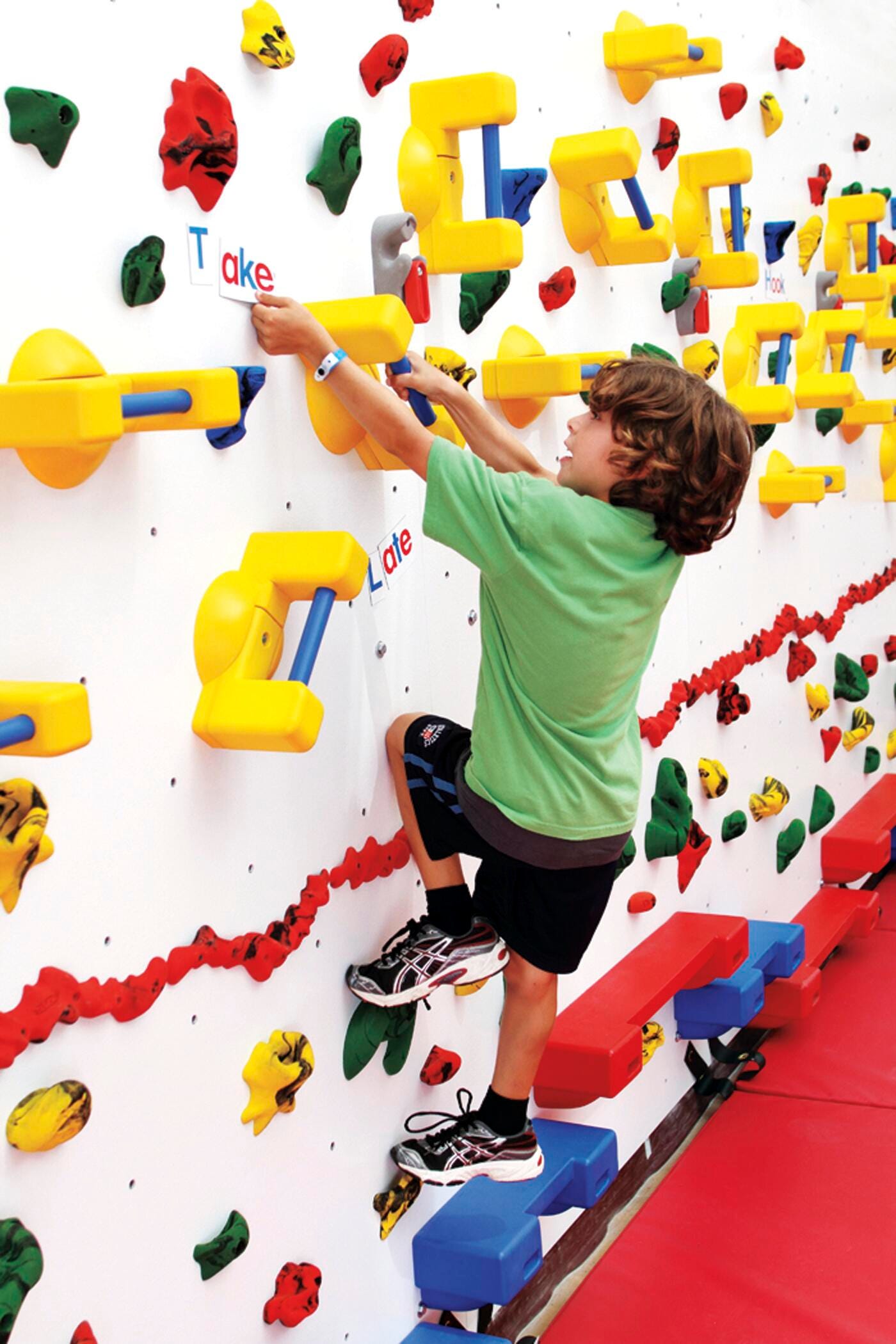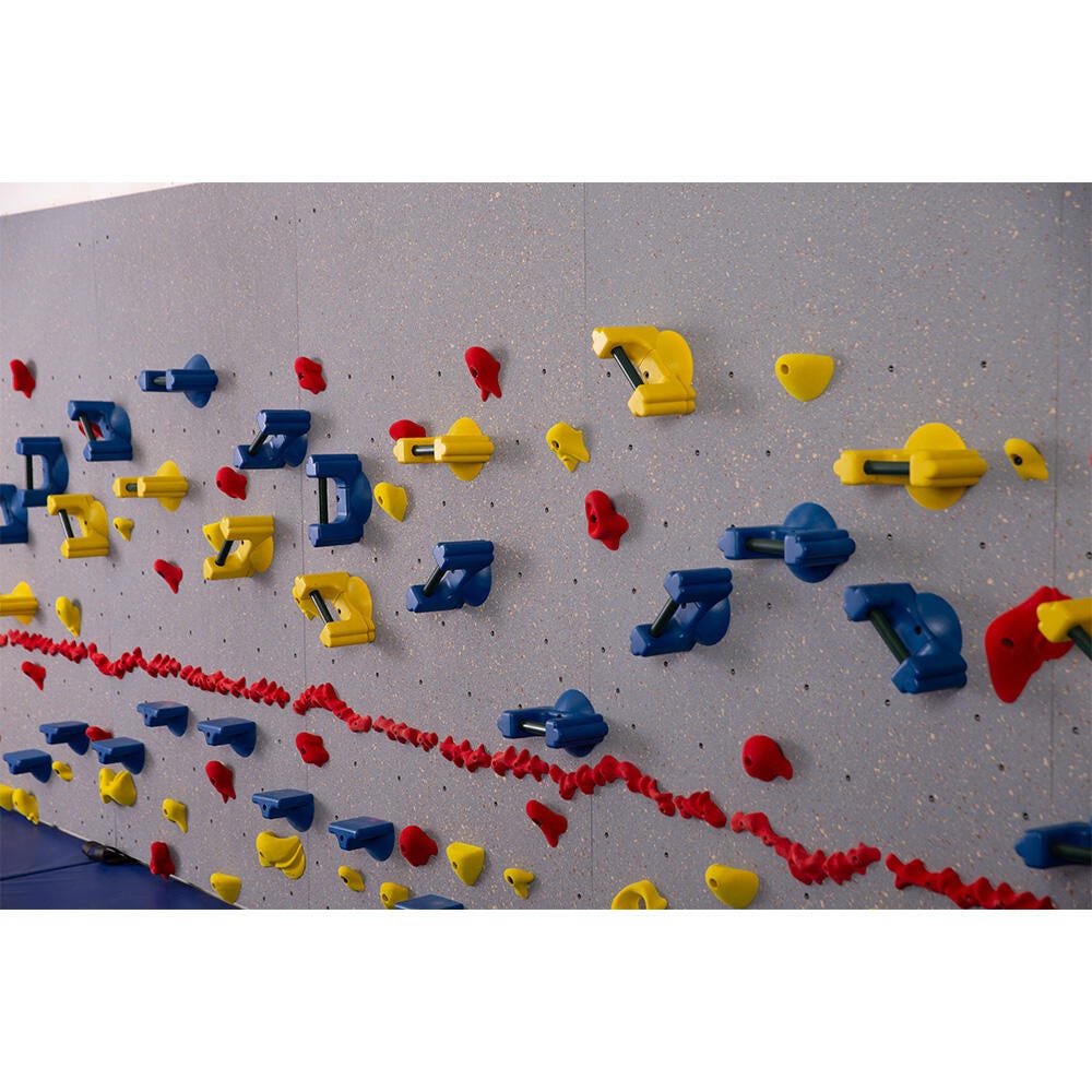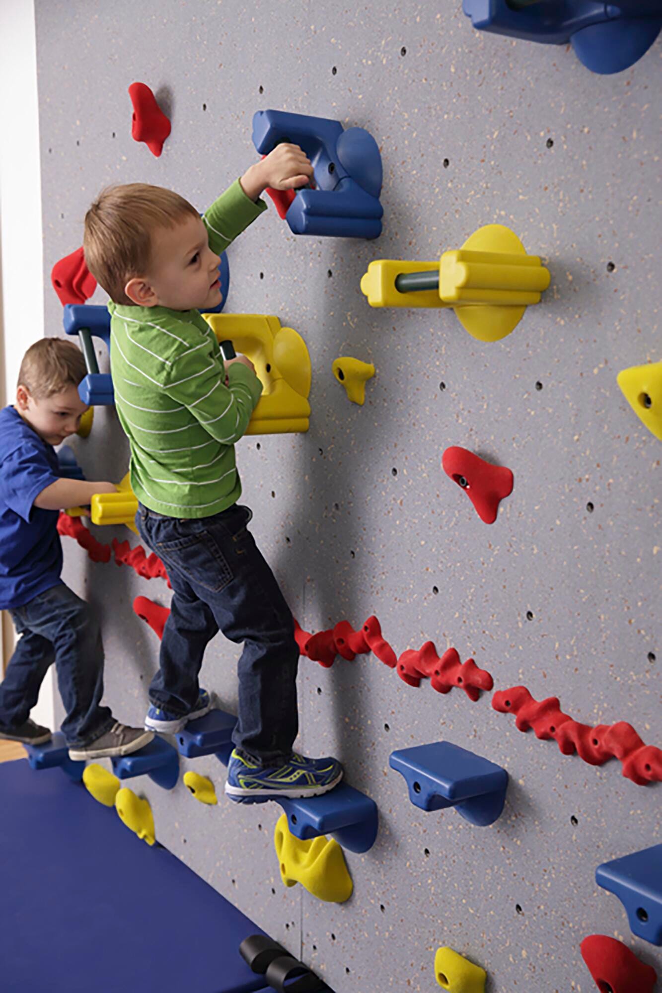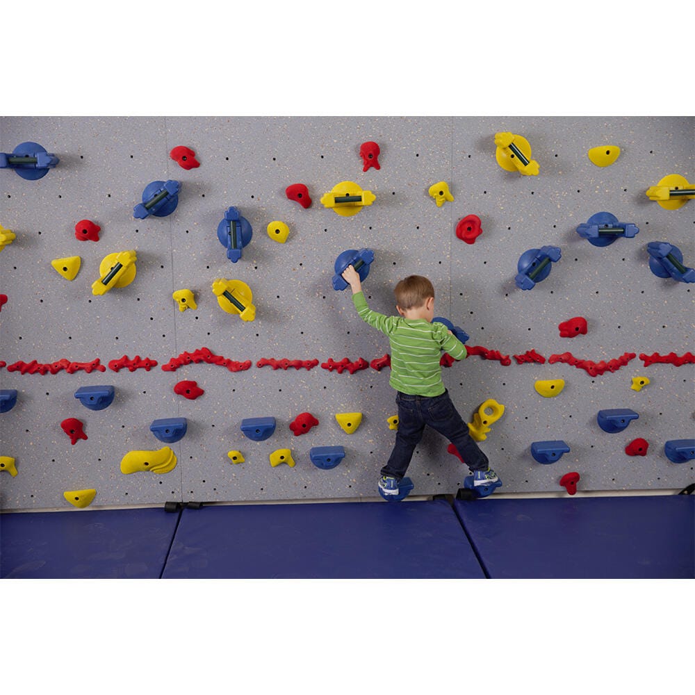 These unique learning opportunities enhance any early childhood program. The 6-foot high climbing wall features blue, red and yellow hand holds in a variety of large, child-friendly shapes, including grab-bar style hand holds and ledge-style footholds to make the introduction to climbing easier. Blue hand holds are the largest and easiest to grip. The yellow holds come in a variety of sizes and offer a light challenge. The red holds are medium sized and provide the most challenge. Climbers can choose to use any color hand hold, or try the extra challenge of climbing using only holds of the same color. Our signature Red-Relief Line is a safety feature that reminds climbers to stay within a distance of 2-1/2 feet from the floor and is a helpful tool for the climbing wall supervisor. On walls 20 feet or longer, there are also ten animal-shaped hand holds on the wall. Children are excited to look for, and climb, on the turtle, dragonfly, hippo and more!Includes:
