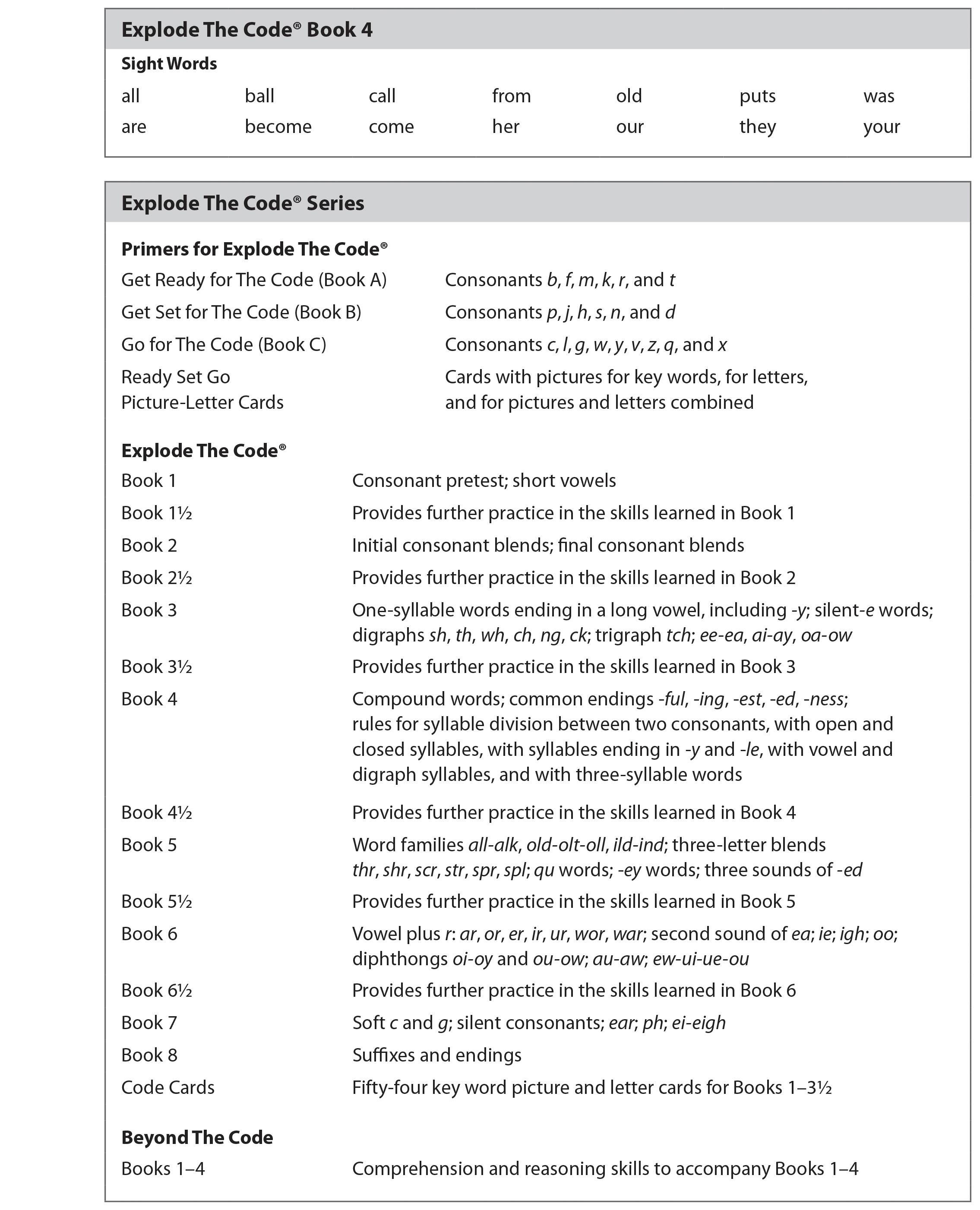 • Explode The Code Half Books 1-1/2 through 6-1/2 provide extra practice, enabling students to read words, phrases, sentences, and stories independently