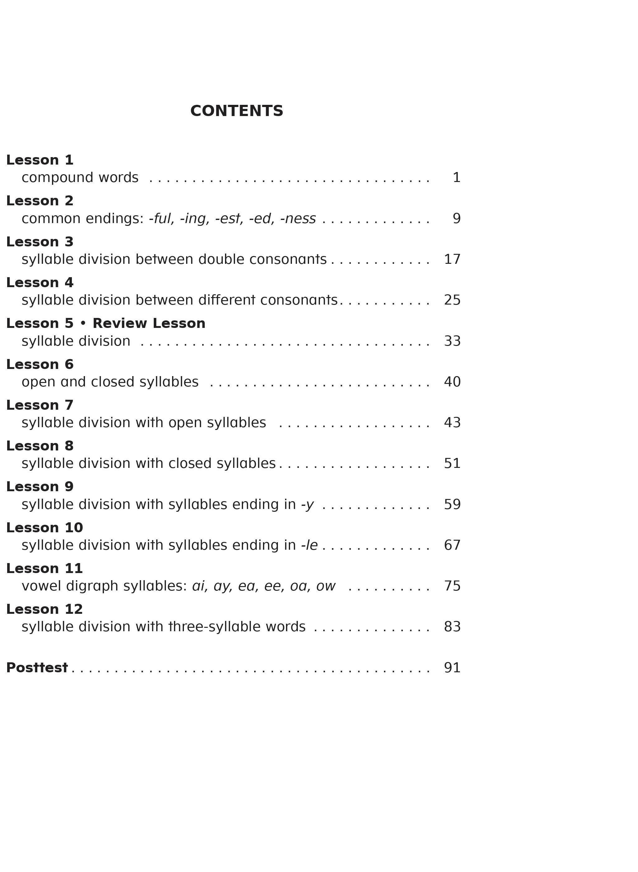 • Book 4 introduces concepts that include compound words, common endings, syllable types, endings -ful, -wing, -est, -ed and -ness to make new words, and more