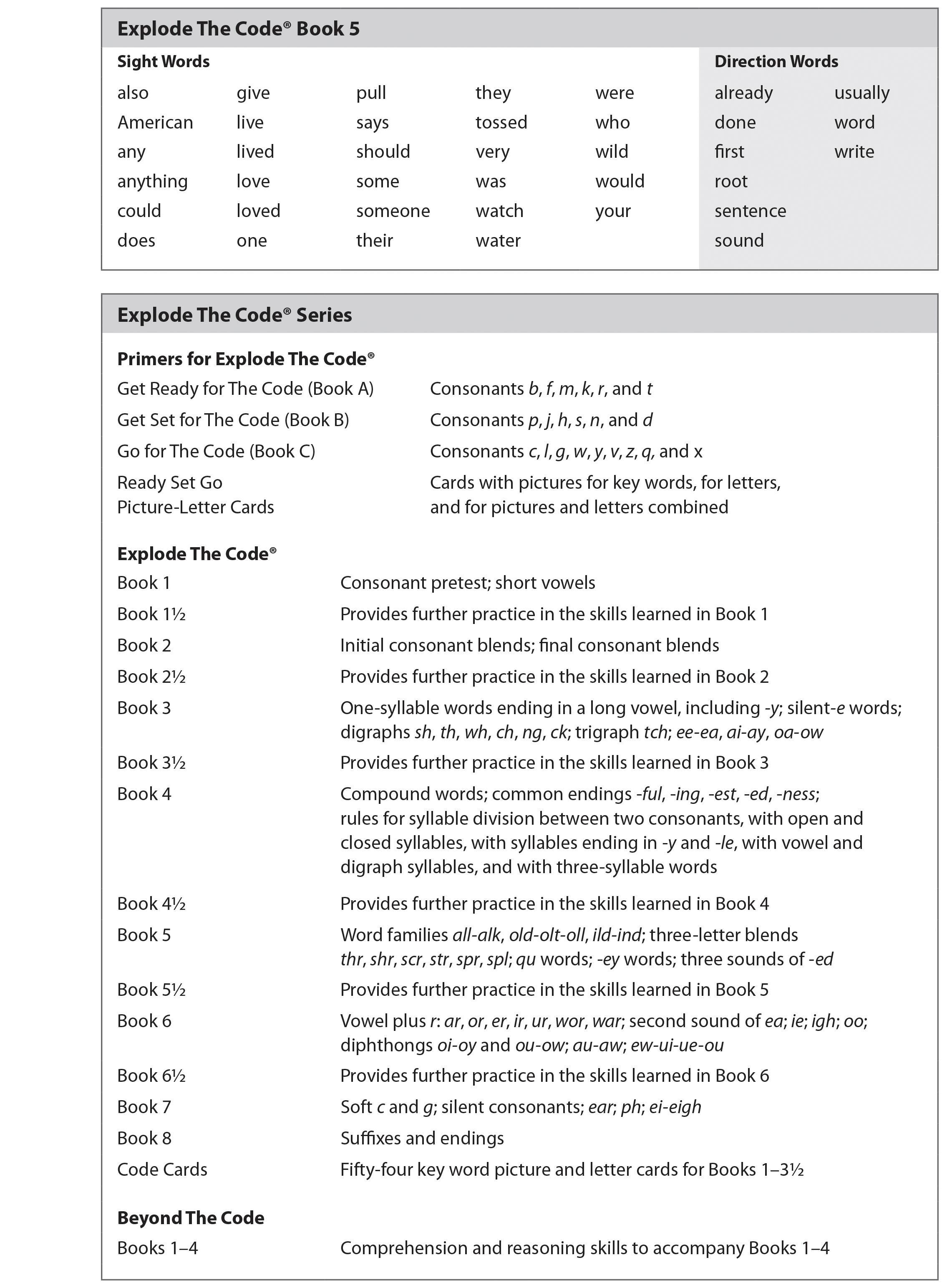 - Explode The Code workbooks help build essential reading skills that include phonemic awareness, phonological awareness, phonics, vocabulary, fluency, spelling, comprehension, and writing
