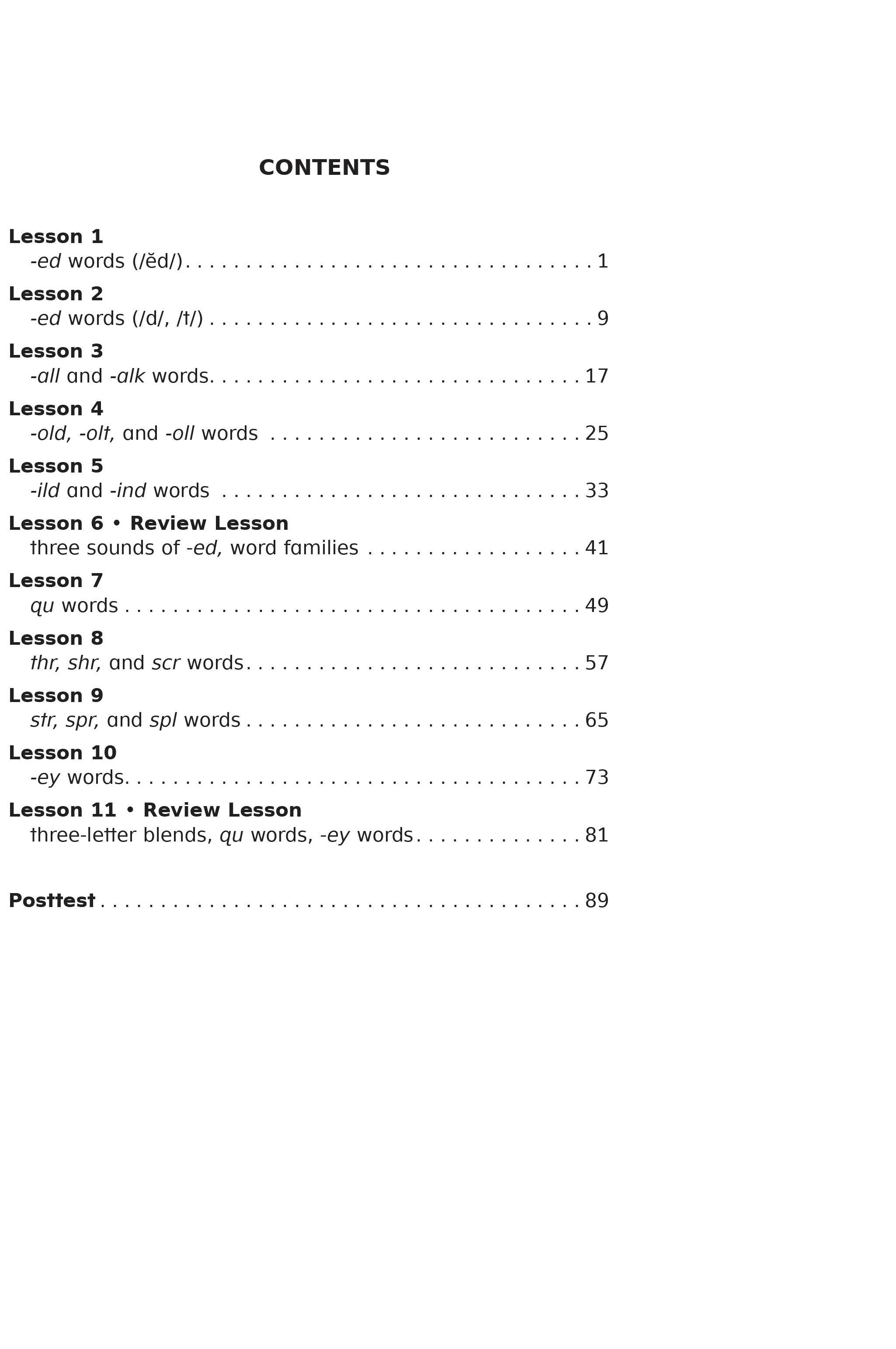 - Book 5 introduces concepts that include word endings -ed and -ey, word families including all-alk, old-olt-oll, ild-ind, the digraph qu, 3-letter blends, and more