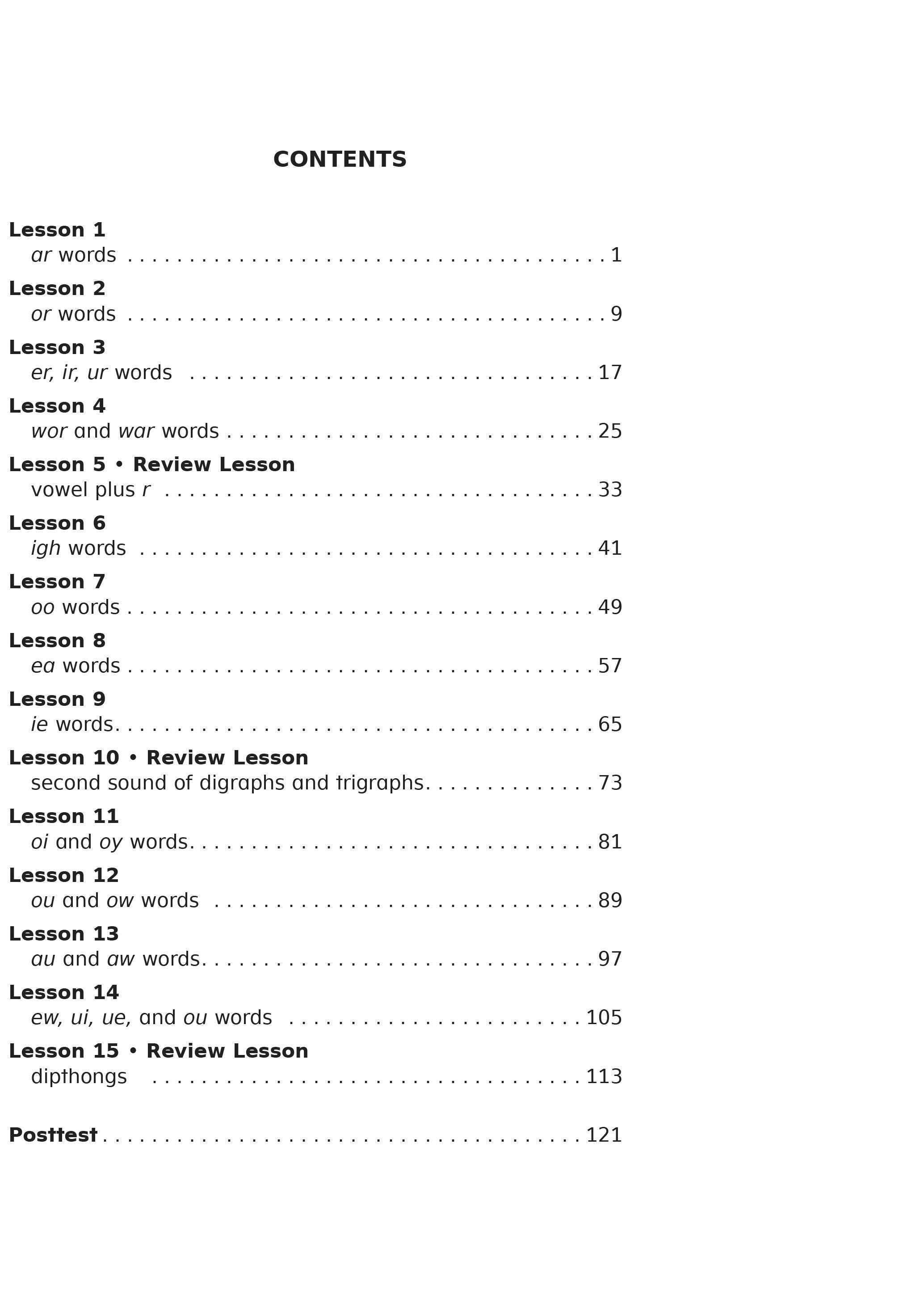 • Book 6 introduces concepts that include r-controlled vowels, silent letters (-igh), vowel diphthongs, and more