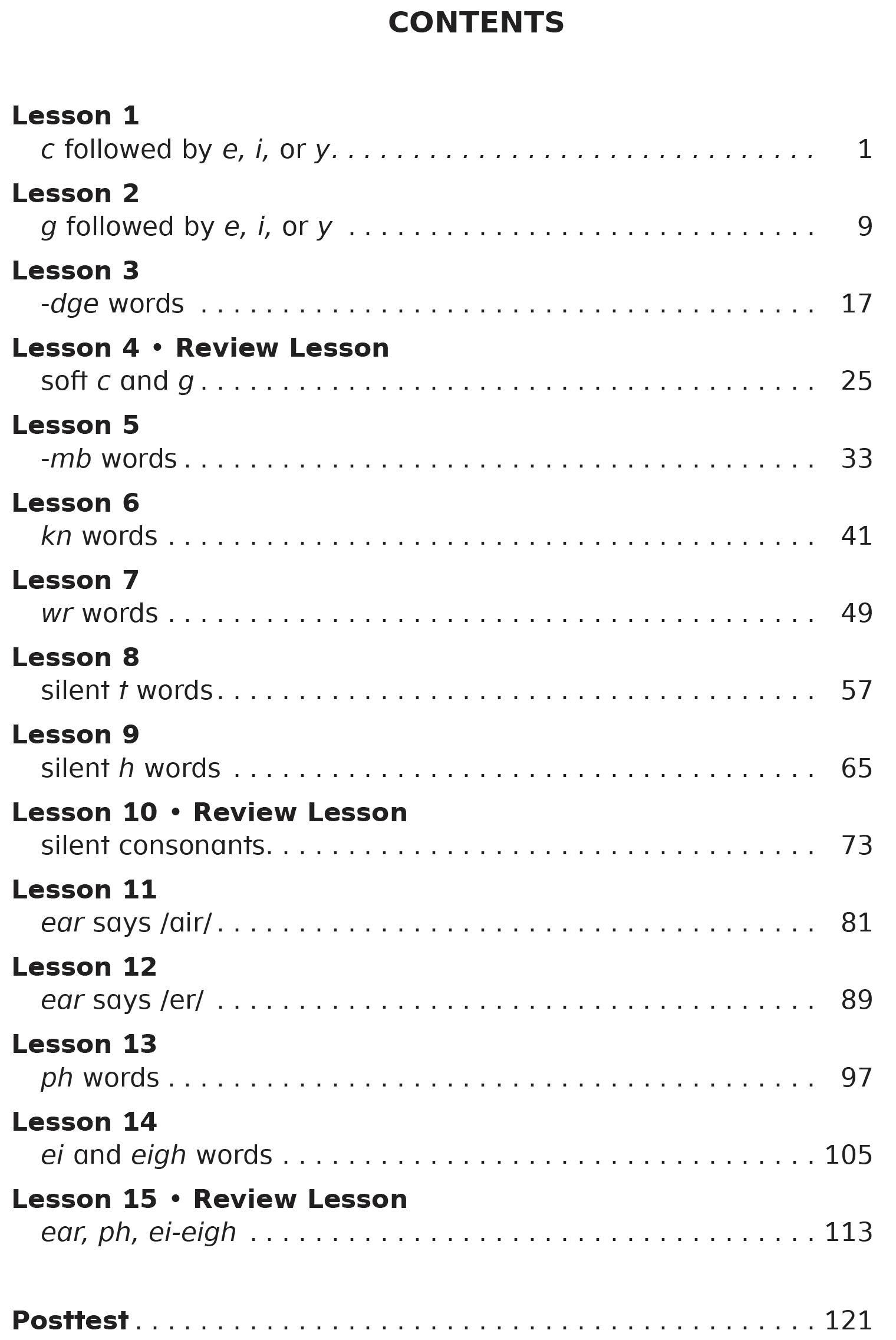 • Book 7 introduces sounds of soft c and g, silent consonant patterns (like -dge, -mb, kn, wr, and silent t and silent h words), sounds of ear, ei, eigh, and ph words, and more