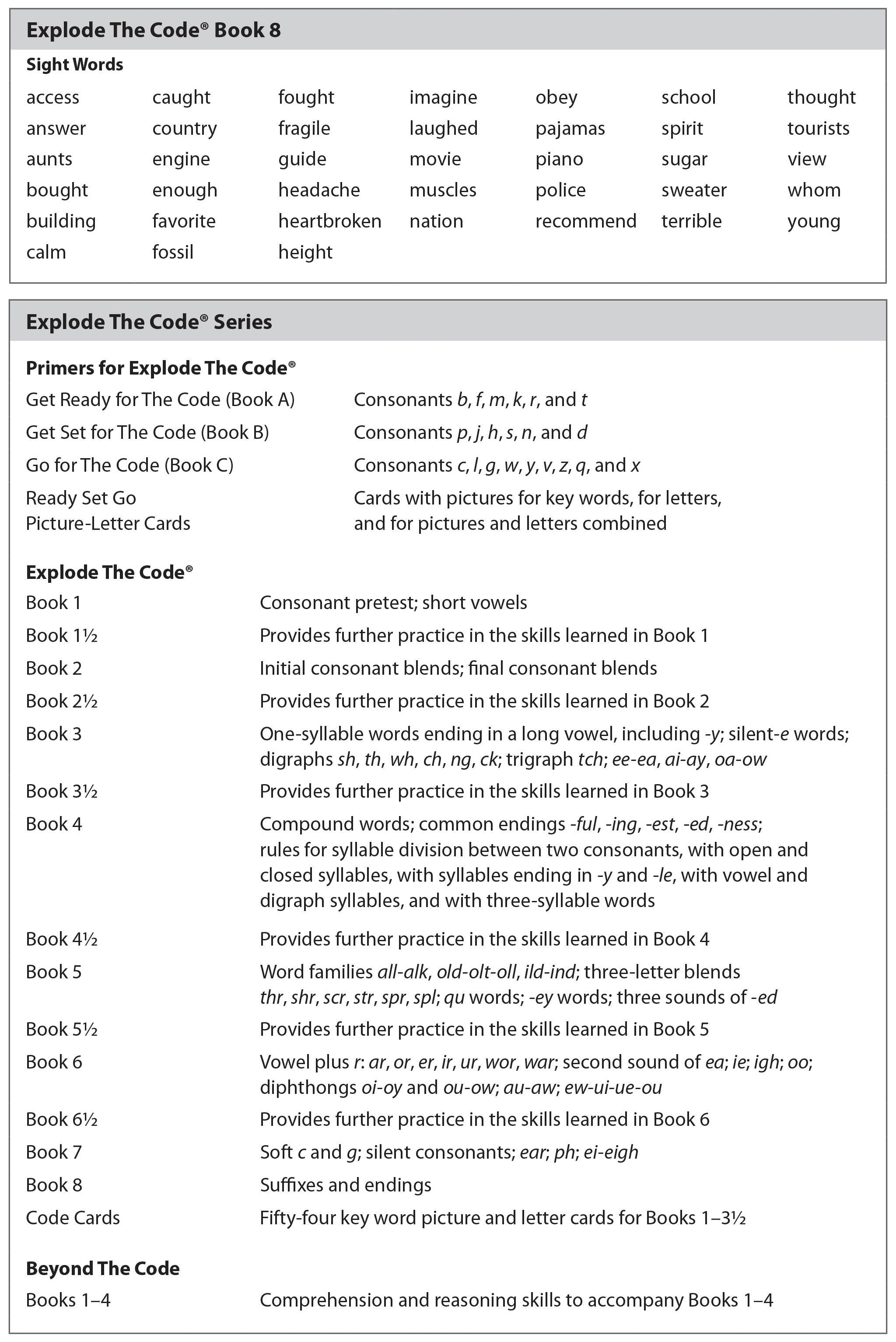Softcover phonics workbook is recommended for Grades 1 to 4 (with included accommodations for English Language Learners and struggling readers). Enjoy the full Explode The Code Book series as desired (available in Books 1 to 6, each also with a 1/2 number for additional practice, and Books 7 and 8; each sold separately).