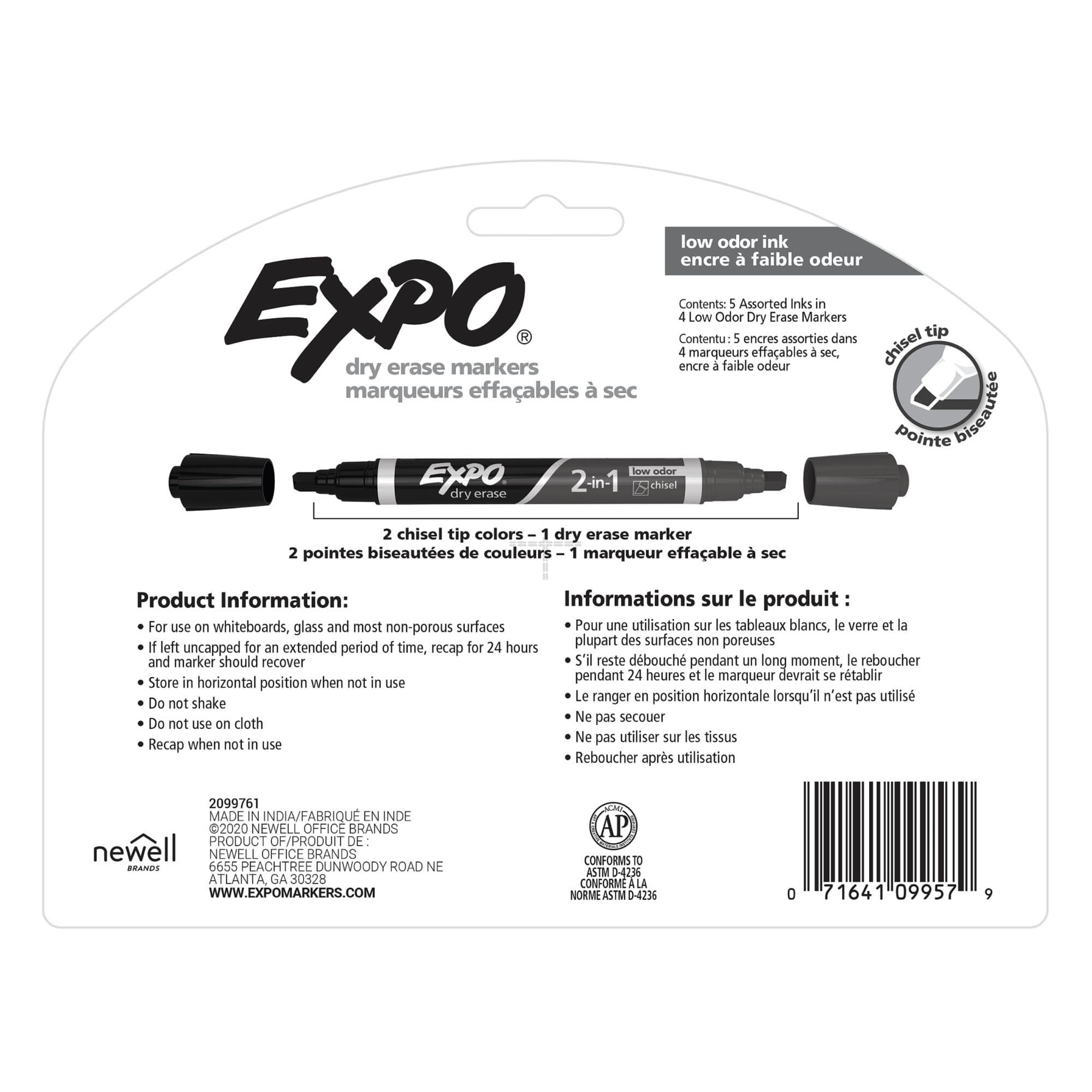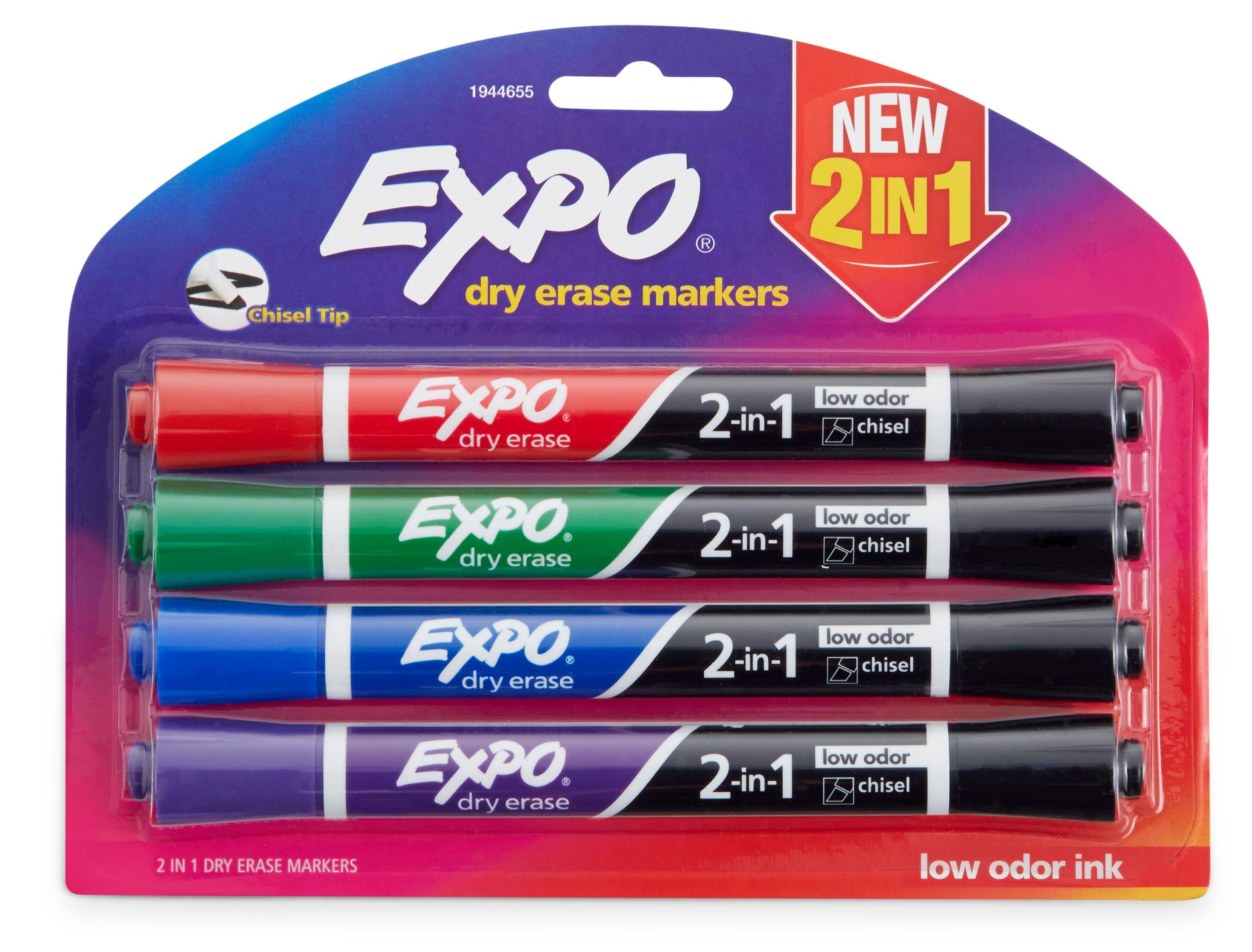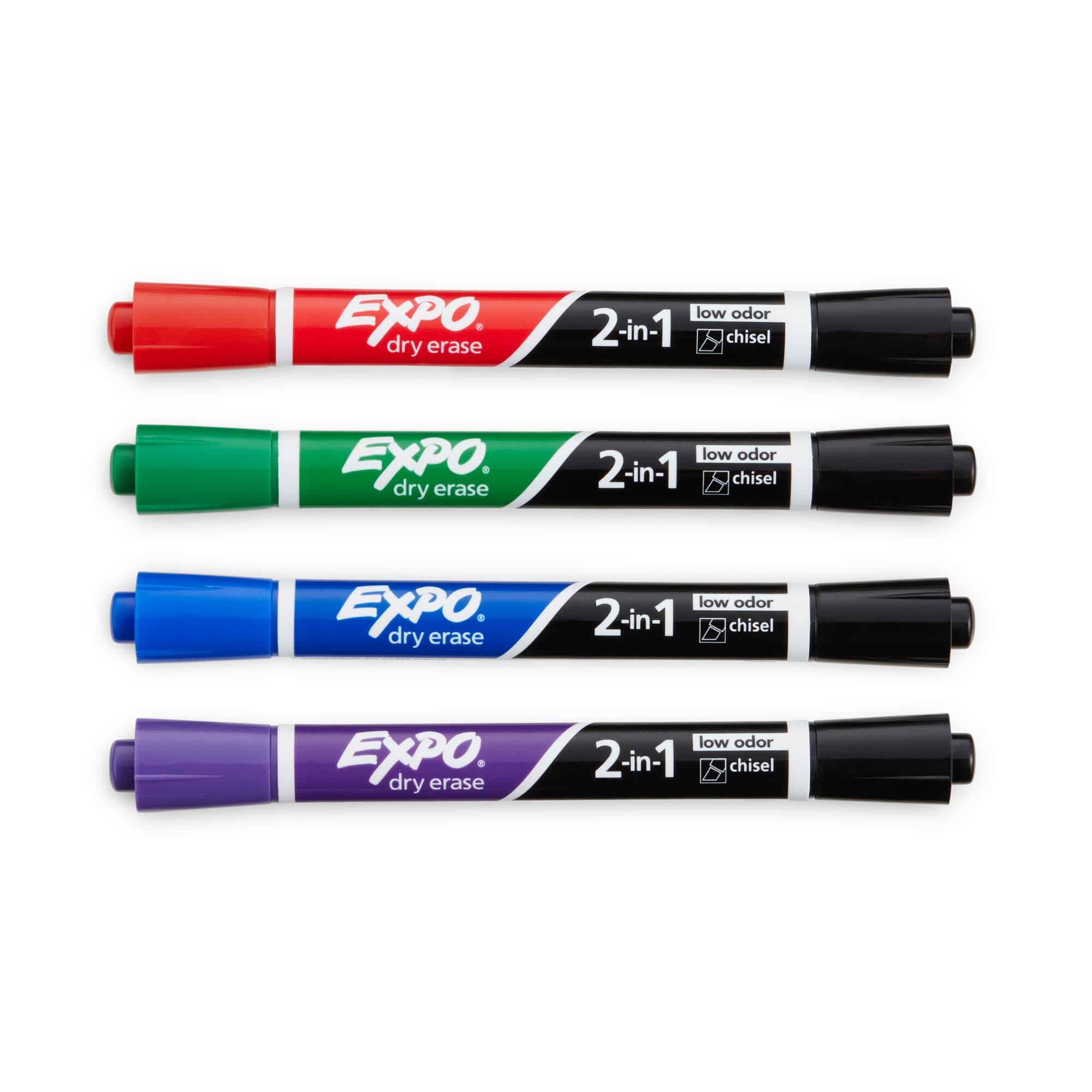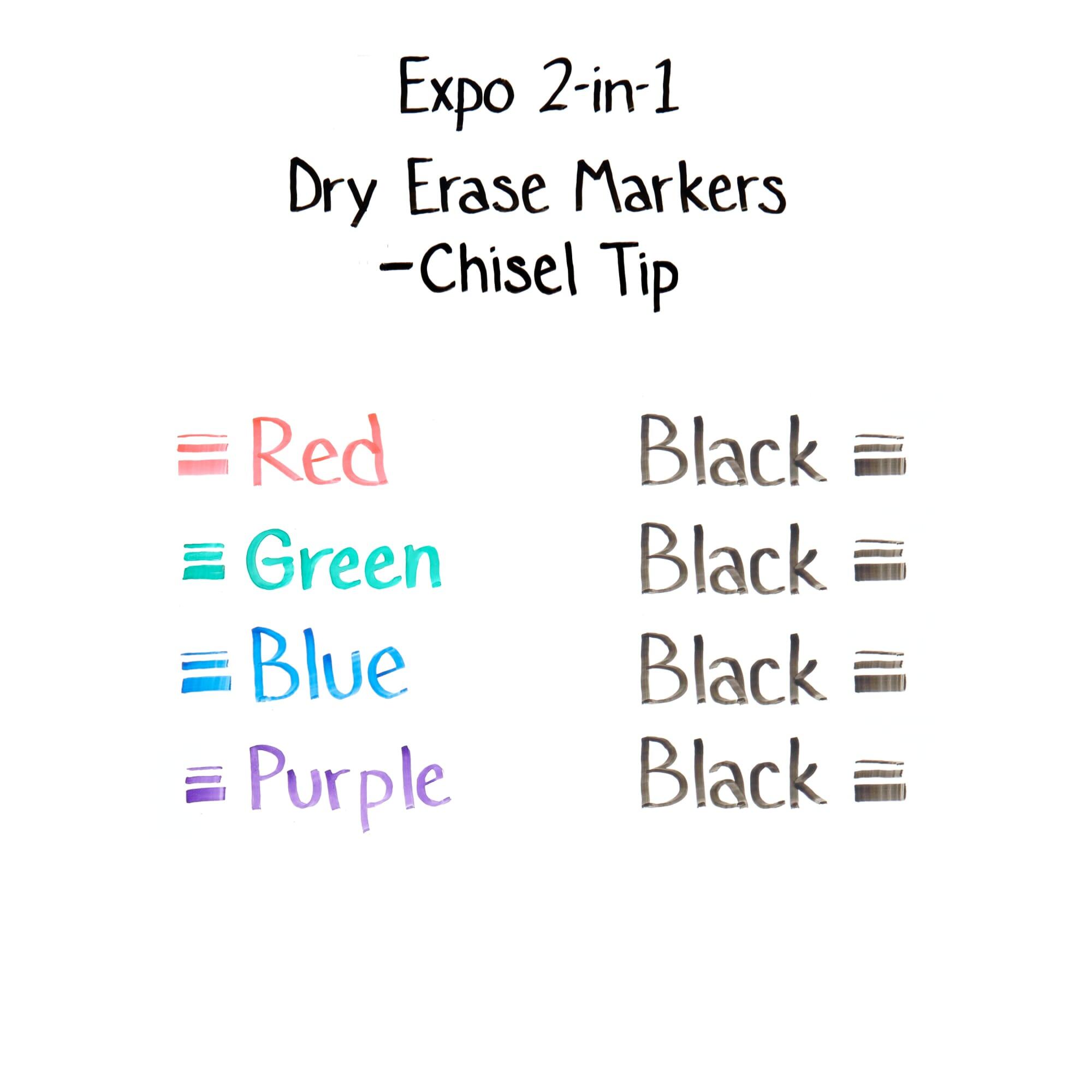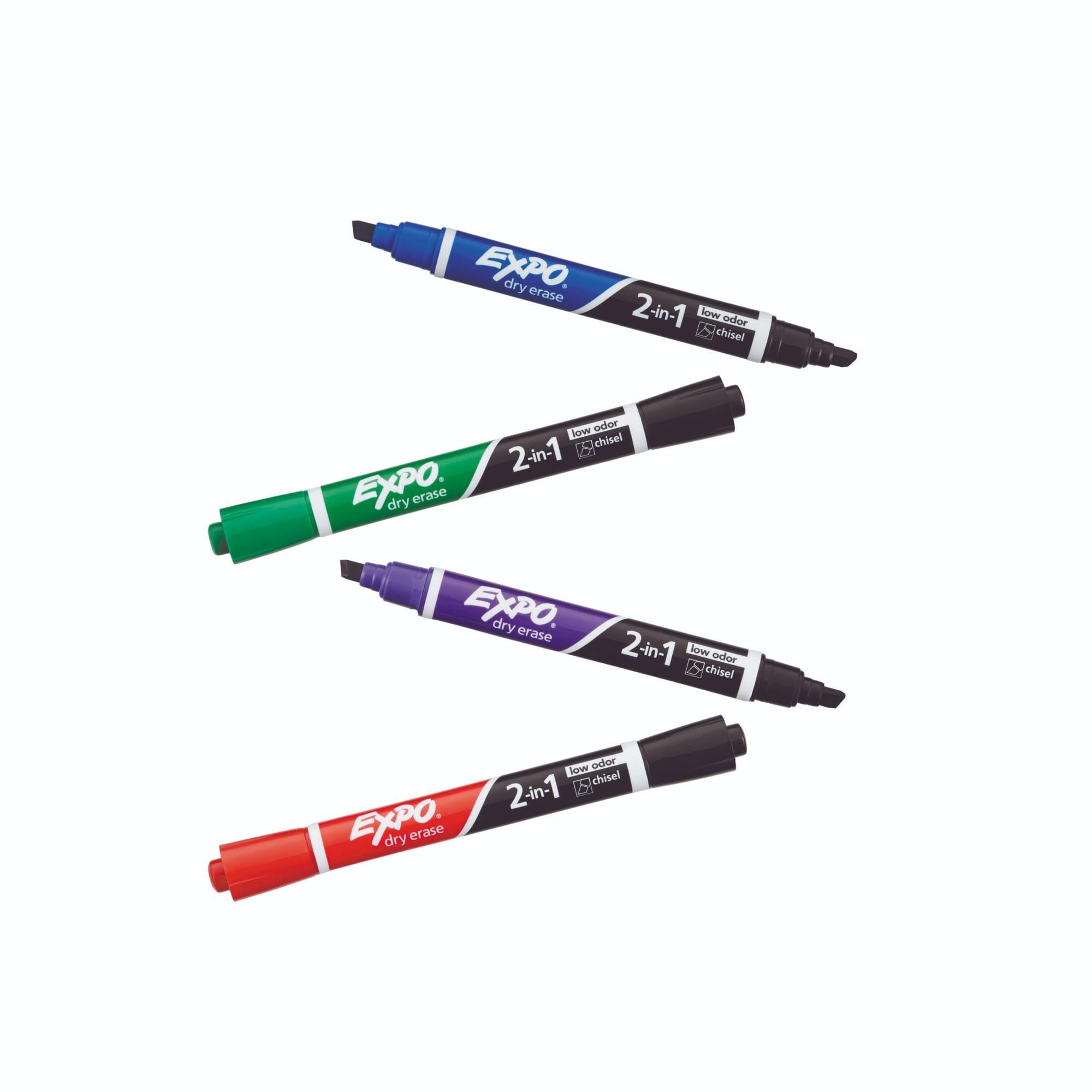 These 2-in-1 Dry Erase Markers from EXPO boast an innovative dual-ended construction that delivers 2 colors per marker. Each marker features an end with a bold color, an end with a rich black, and a chisel tip that marks in bold, medium, and fine lines. Write with precise lettering with one end and boldly add emphasis with the other without putting your marker down. The set of 4 markers contains the following assortment: 1 red/black, 1 blue/black, 1 green/black, and 1 purple/black.