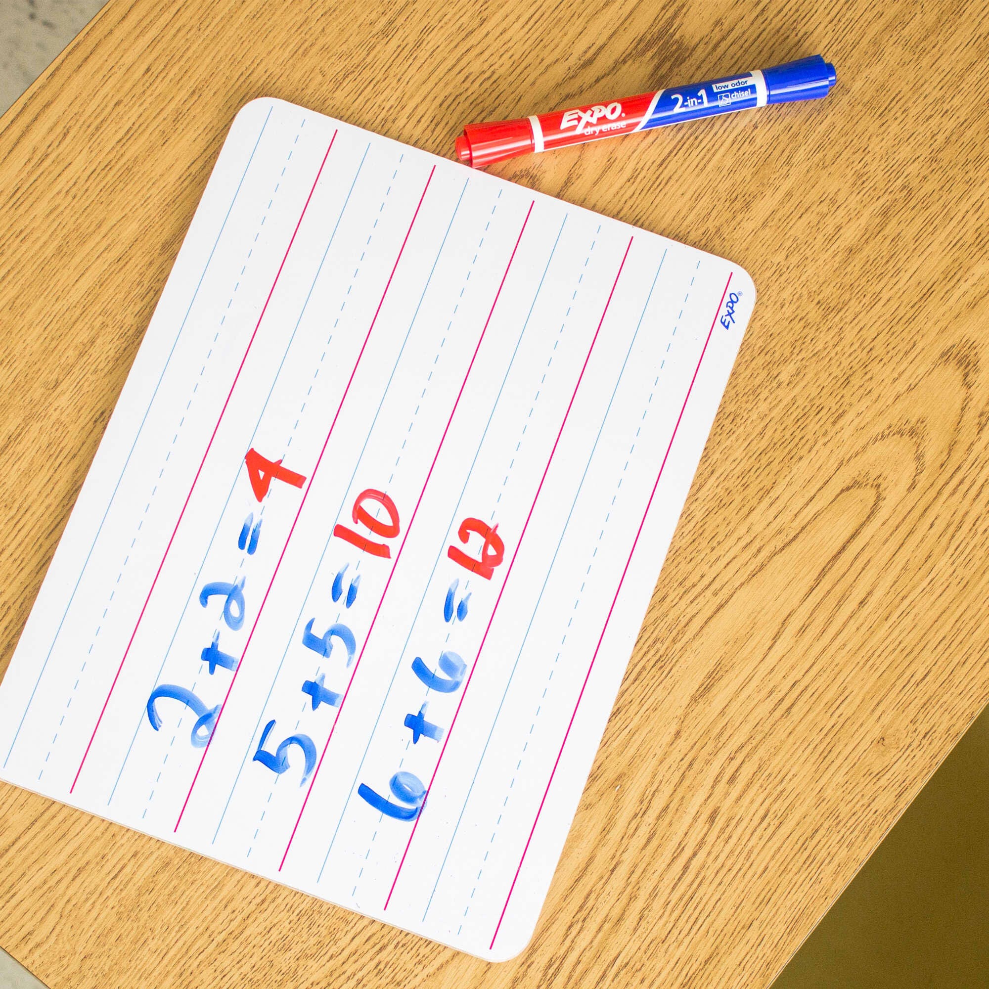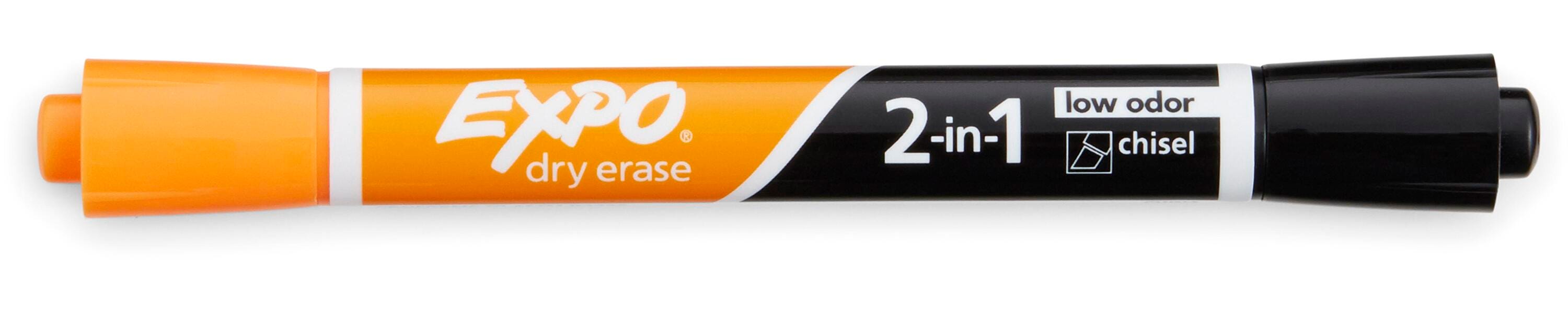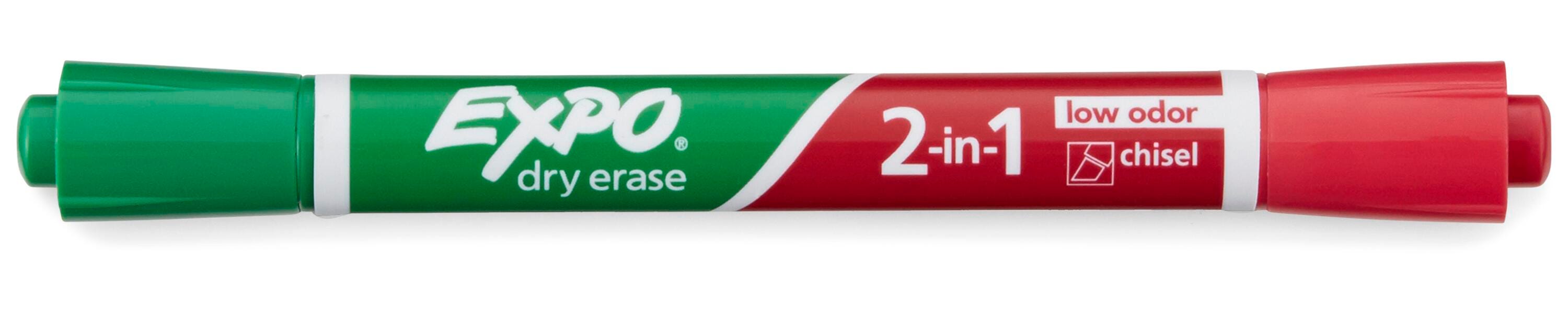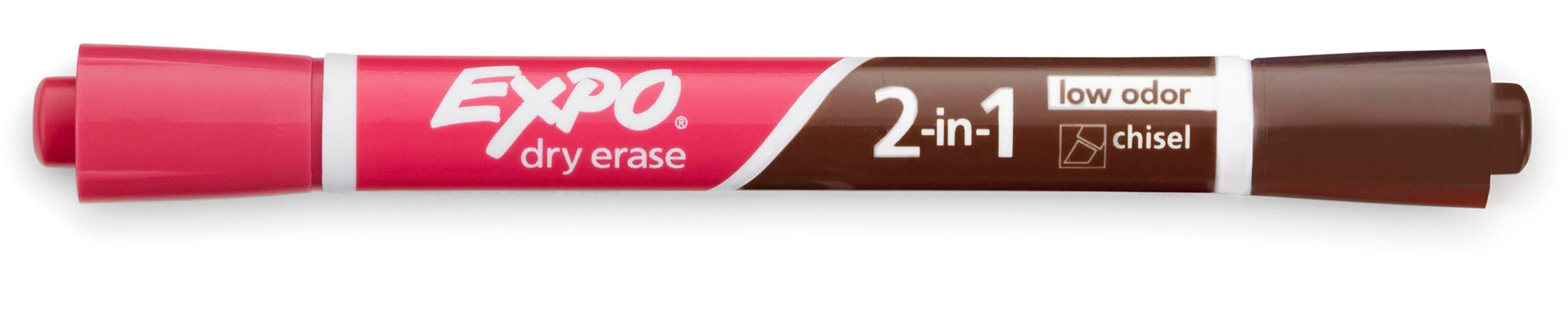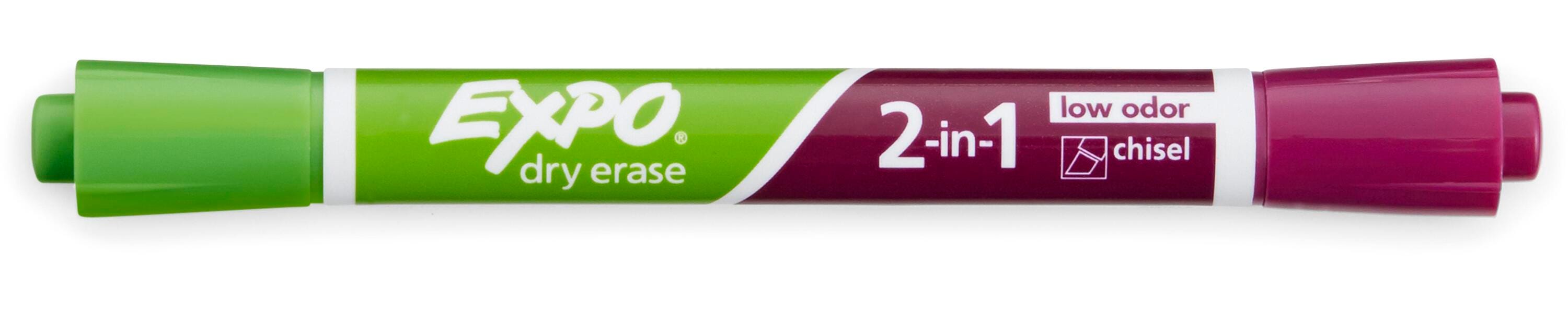The EXPO 2-in-1 Dry Erase Markers feature an innovative dual-ended design so you get 2 colors per marker. These markers have a different bold shade at each end and a chisel tip that marks in bold, medium, and fine lines. That means you can create precise lettering with one color and boldly add emphasis with another without putting your marker down. The set of 8 markers contains the following assortment: 1 red/black, 1 blue/green, 1 orange/light blue, 1 pink/plum, 1 light brown/dark red, 1 lime green/dark green, 1 dark blue/light blue and 1 dark purple/brown.