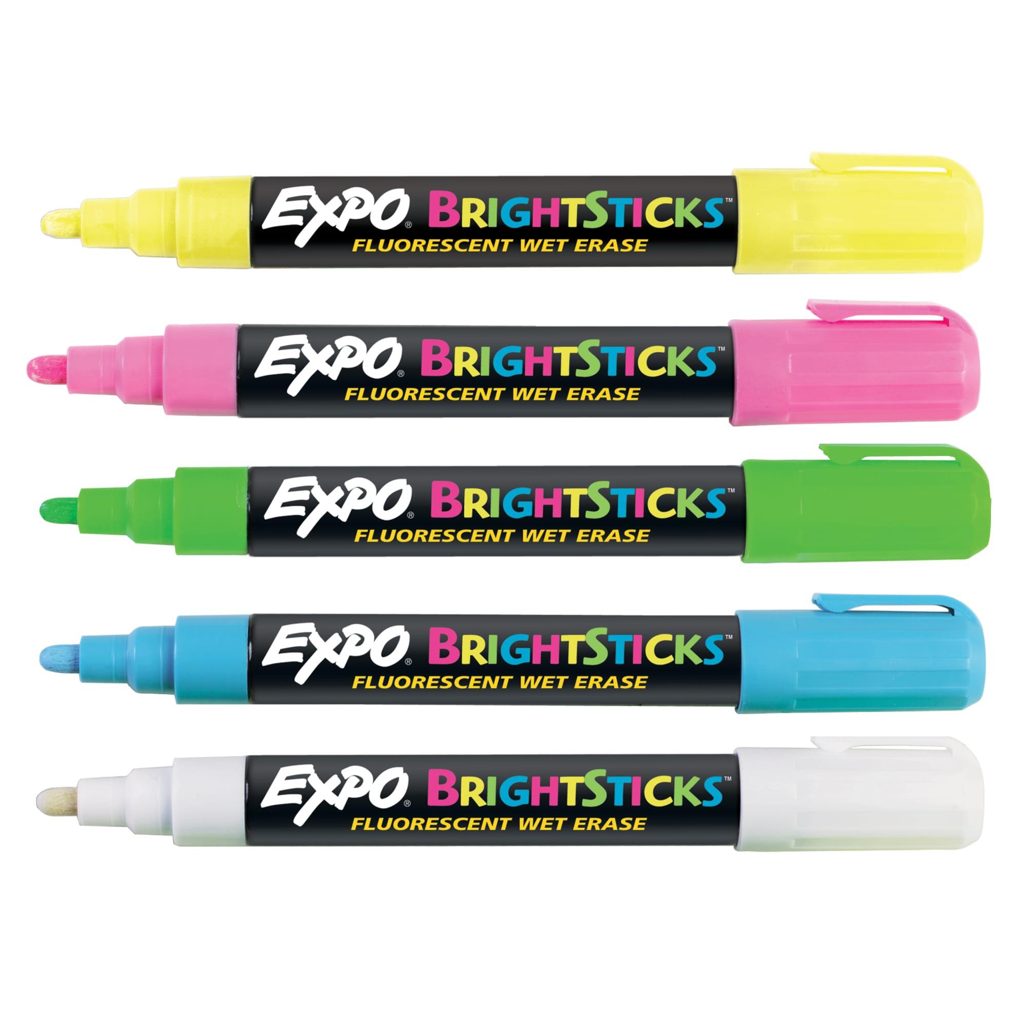 The EXPO Bright Sticks Wet Erase Marker will take your displays to bright heights. These markers have vibrant ink that looks fluorescent on black marker boards, light boards, glass, and even whiteboards. Each marker features a durable bullet tip that creates marks that a sure to stand out. This set of 5 contains the following assortment of fluorescent colors: yellow, pink, green, blue, and white.
