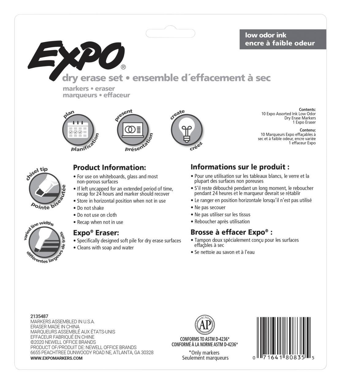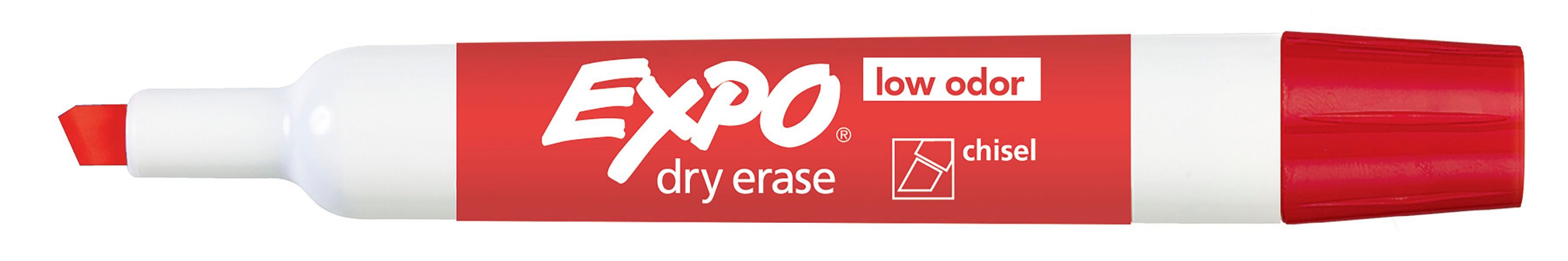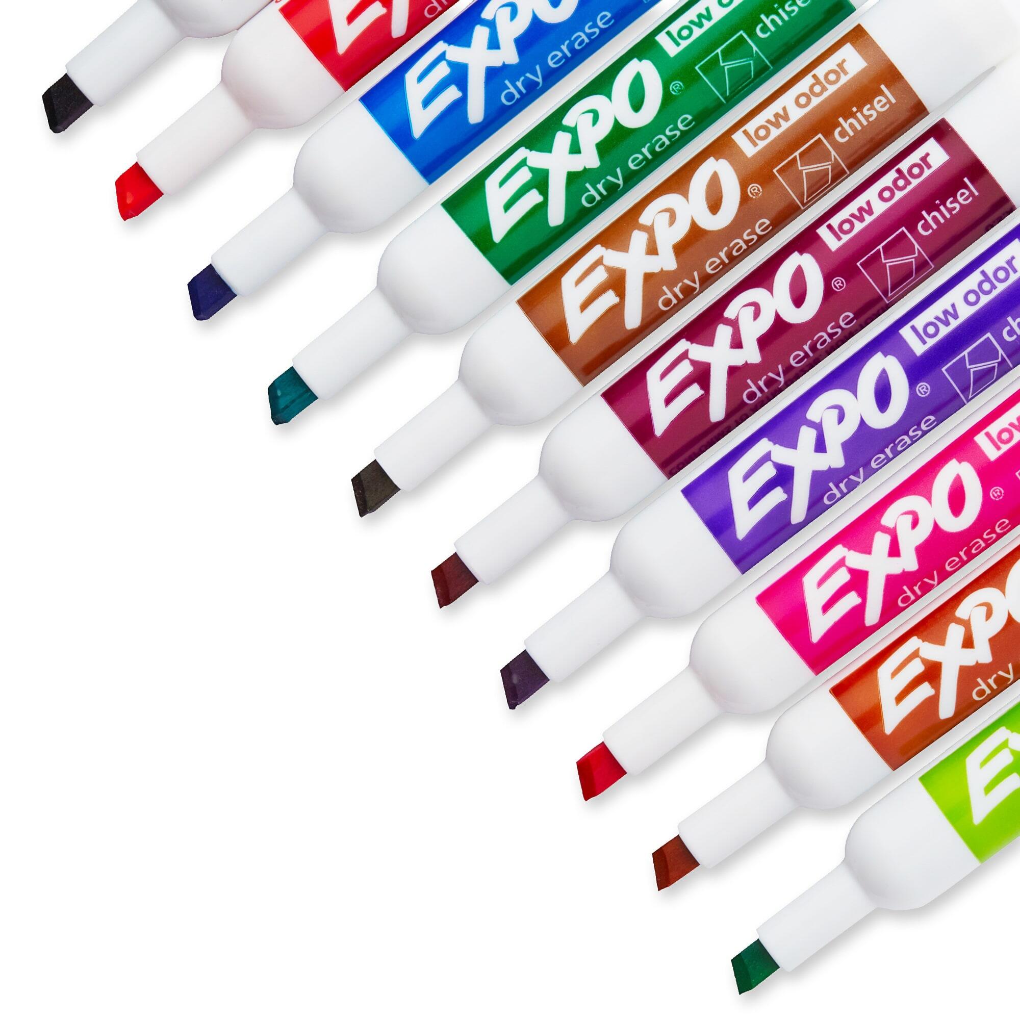 Add excitement, emphasis, and color with minimal odor! EXPO low-odor markers are perfect for dry-erase surfaces in meeting rooms or classrooms. Each marker has a chisel tip that allows for broad, medium, and fine lines and markings. The specially formulated ink erases easily from most nonporous surfaces, has virtually no odor, and is bold enough to see from a distance. Plus, the included eraser effortlessly wipes away marks to keep your whiteboard clean. This kit includes 1 eraser and 10 markers in an assortment of vibrant colors.