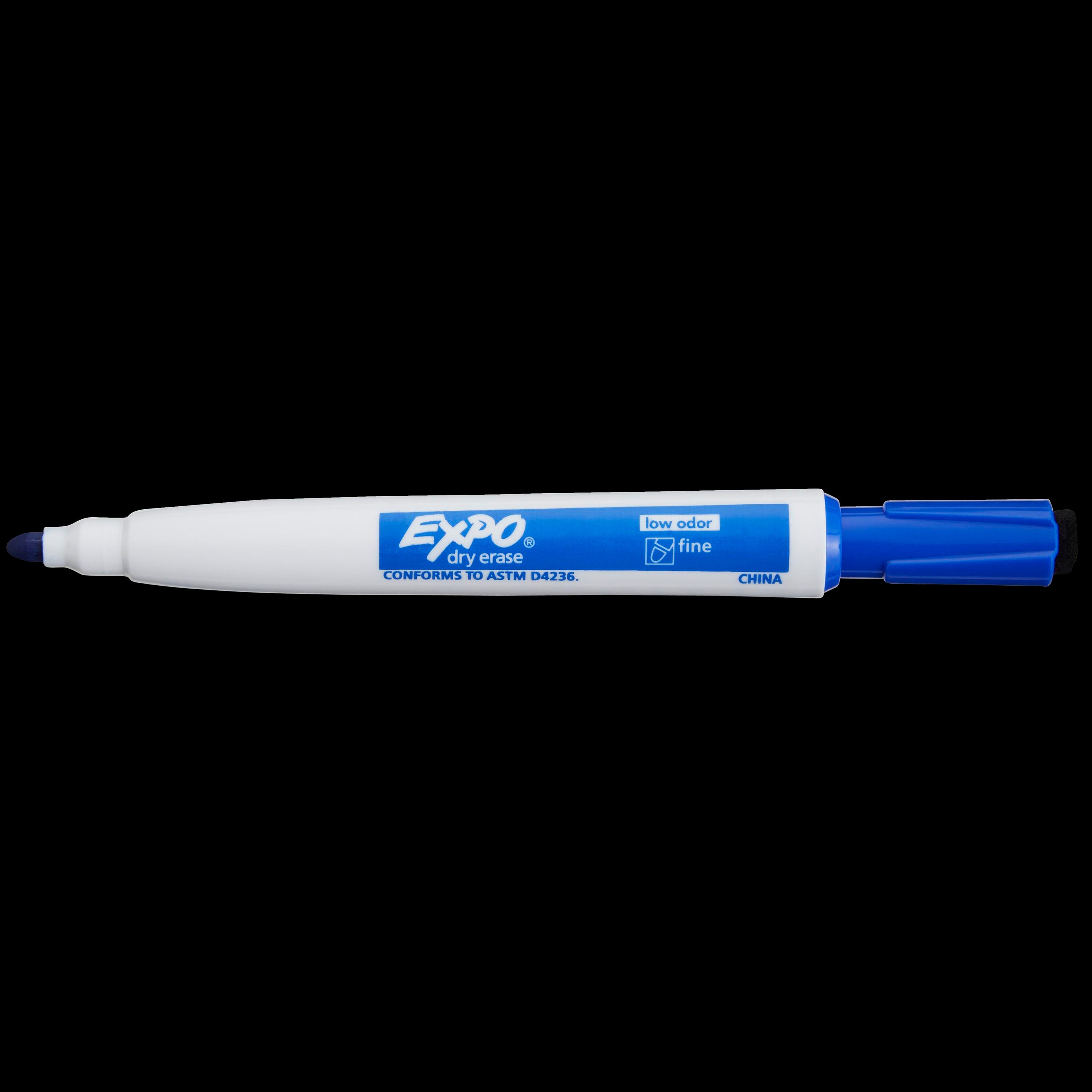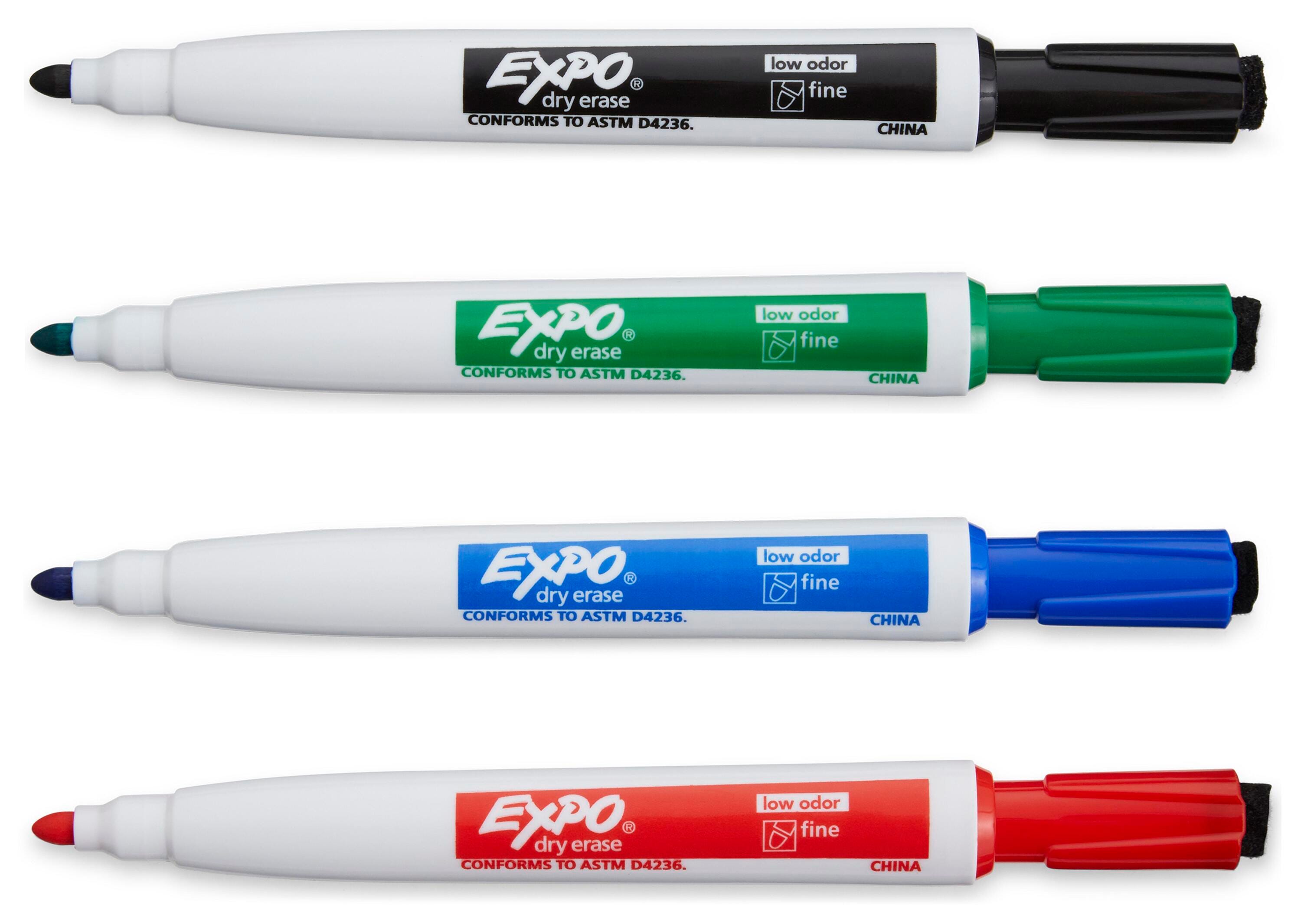 EXPO Magnetic Dry Erase Markers boast a useful magnetic strip that will stick to most metal surfaces so your markers stay where you want them, perfect for easy storage and access in busy offices or classrooms. Each marker also features an integrated eraser in the cap and premium low-odor, quick-drying ink so you're ready to tackle any task. This set of 4 markers contains the colors: black, green, blue, and red.Features