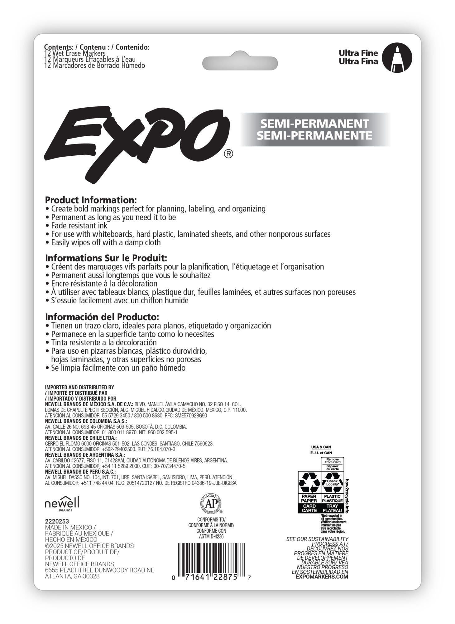 EXPO Wet Erase Semi-Permanent Markers, Ultra Fine Point, Assorted Colors, Set of 12