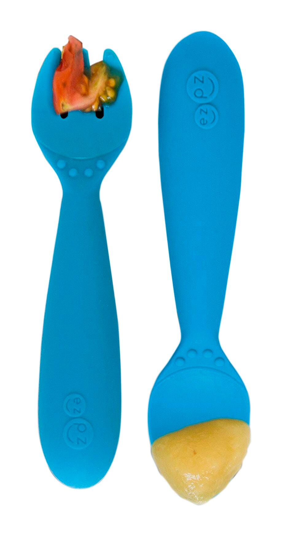 Learning to self-feed is an important developmental milestone, and the ezpz Mini Utensils are designed to help toddlers learn how to eat with a spoon (scooping) and fork (piercing). The Mini Spoon and Fork are the most functional, developmentally appropriate toddler utensils on the market. Sensory bumps and raised rim provide sensory awareness. Non-slip grip and short, fat, round handle make grasping more successful. Utensils are made with food grade silicone and nylon (BPA, BPS, PVS, phthalate and latex free) and are Dishwasher safe. Dimensions of spoon and fork are 4-3/8 L x 1 W inches. Appropriate for ages 12 months and up.Features