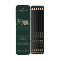 The Pitt Graphite Matte Pencil Set is a revolution in graphite drawing. Unlike other graphite pencils that create a luster when applied heavily, these pencils offer a rich matte look. With no shine or glare, these pencils allow for a stunning and true representation of artwork. Offered in 6 grades of hardness to achieve light to dark strokes. Set includes metal storage tin.Features
