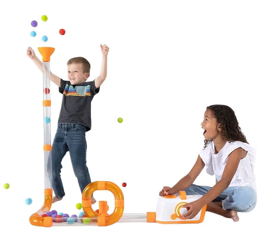 Arrange the tubes and connectors in any way you can imagine. Create loops and swirls. Weave them under tables and over desks. Then, switch on the fan and let the experimentation begin... Can you make the foam balls leap from one tube to the next, or hover in mid-air, or go around and around in an endless cycle? Or, what happens when you set it to low speed vs high speed? What happens when you load the tubes with all the balls, then turn it all the way up? With hours of runtime and loads of balls, tubes, connectors, and accessories included, kids (and adults) will never want to stop exploring!Features