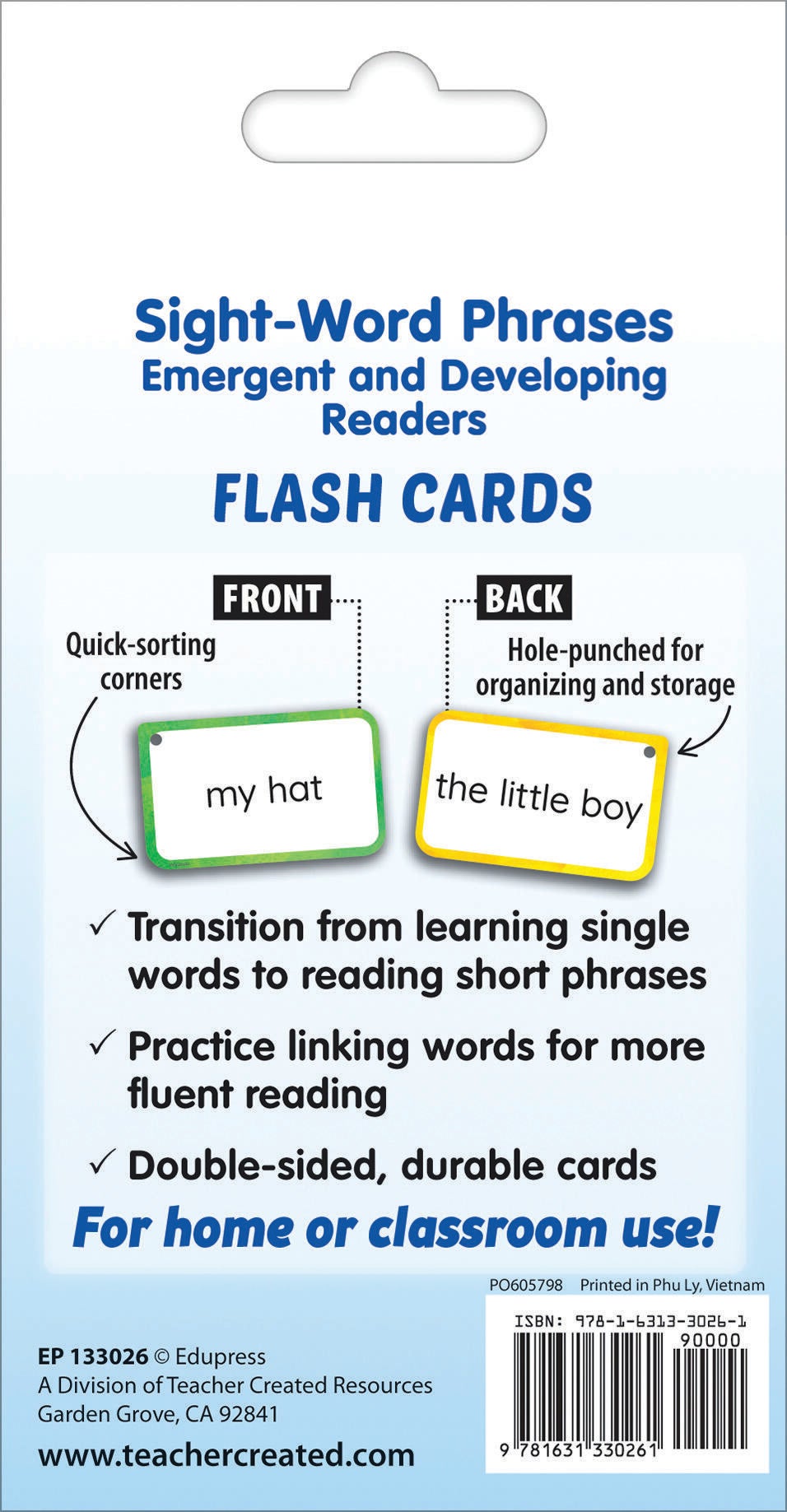 First steps linking words for more fluent reading. This laminated set of 50 phrases is appropriate for children who are learning to read as well as those who struggle with basic sight words and simple phrases. They help emergent and struggling readers to move beyond one-word recognition while reinforcing left-right visual tracking. 50 each. 2 x 8 inch laminated cards.