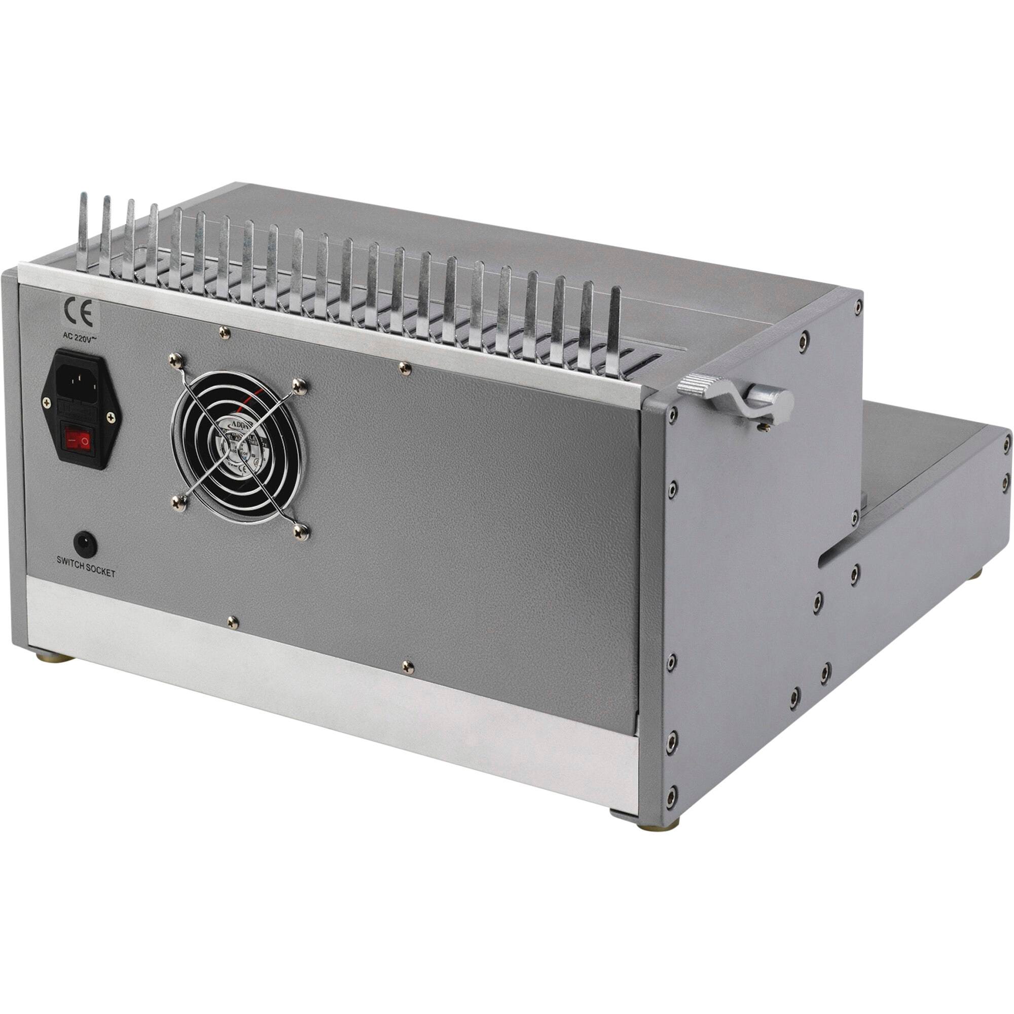 Heavy-duty, commercial binding machine is ideally suited for high-volume use. Effortless foot pedal operation delivers maximum ease of use. Binding machines electrically punches up to 30 sheets at a time and binds documents as large as 500 sheets with a 2 inch comb. Design includes an adjustable punch depth for extra-large documents. Adjustable edge guide easily centers documents. 21 releasable dies can handle a variety of document sizes up to 12 inch wide. Extra-large chip tray has convenient front access.