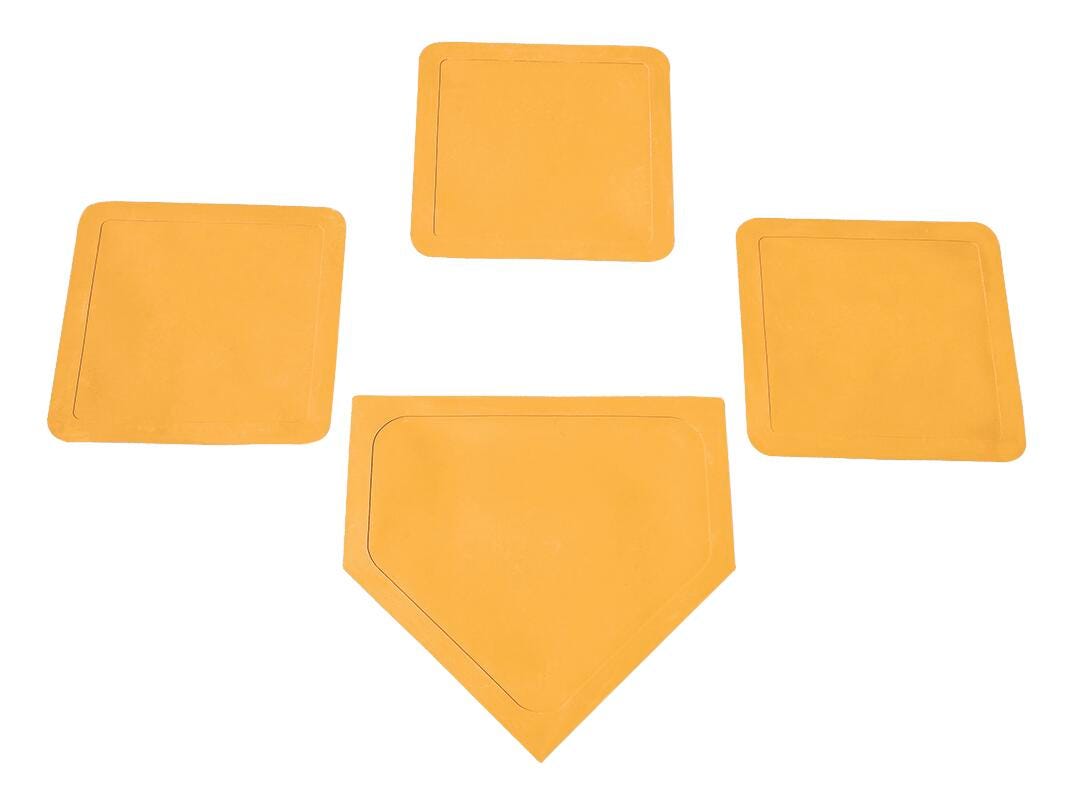 All bases for a complete ballgame! Orange vinyl, tough and washable. Won't slip on wood floors. Three bases and home plate included.Includes: