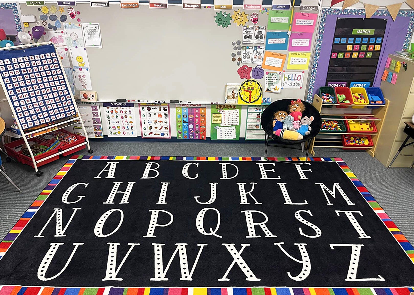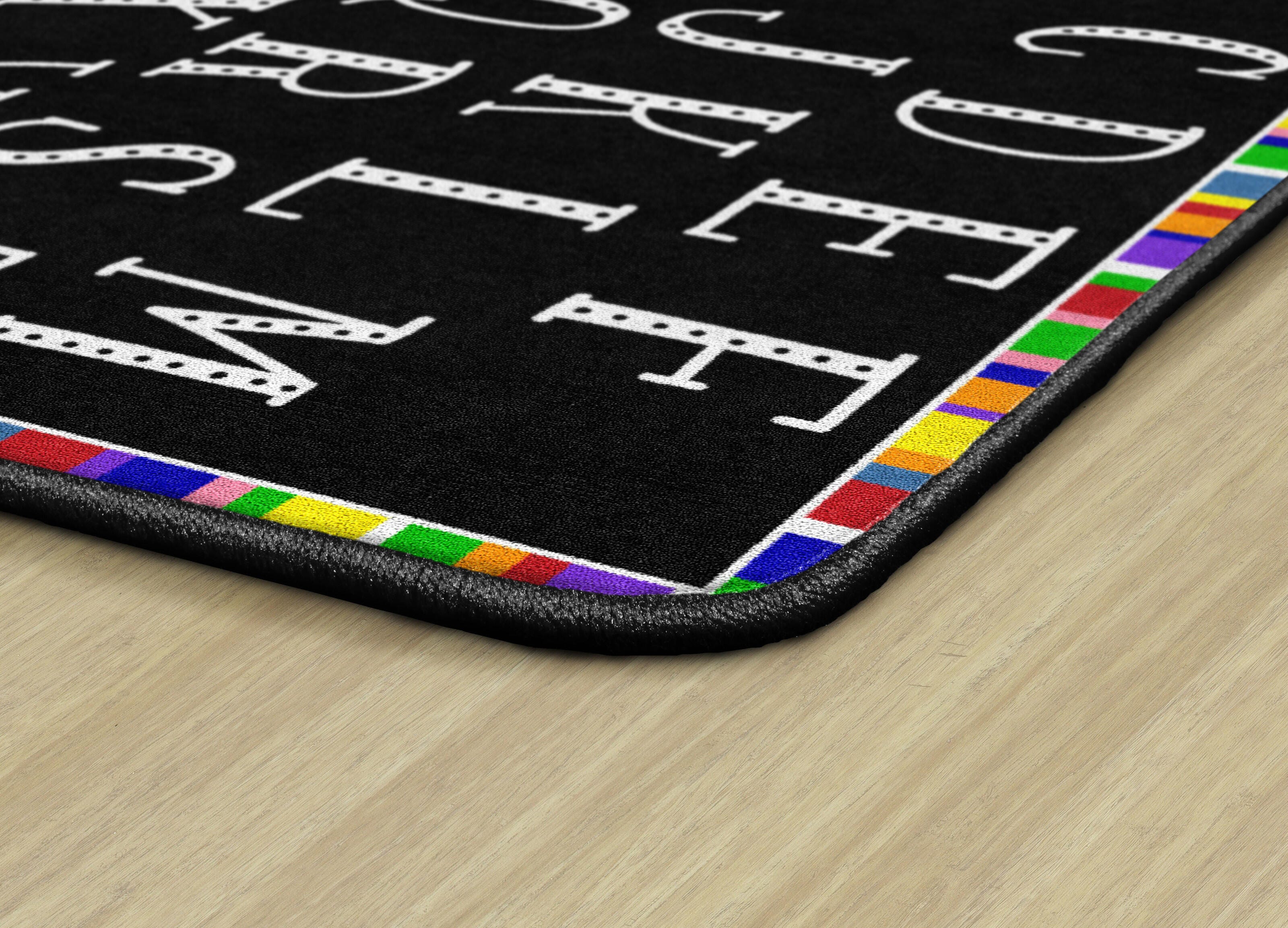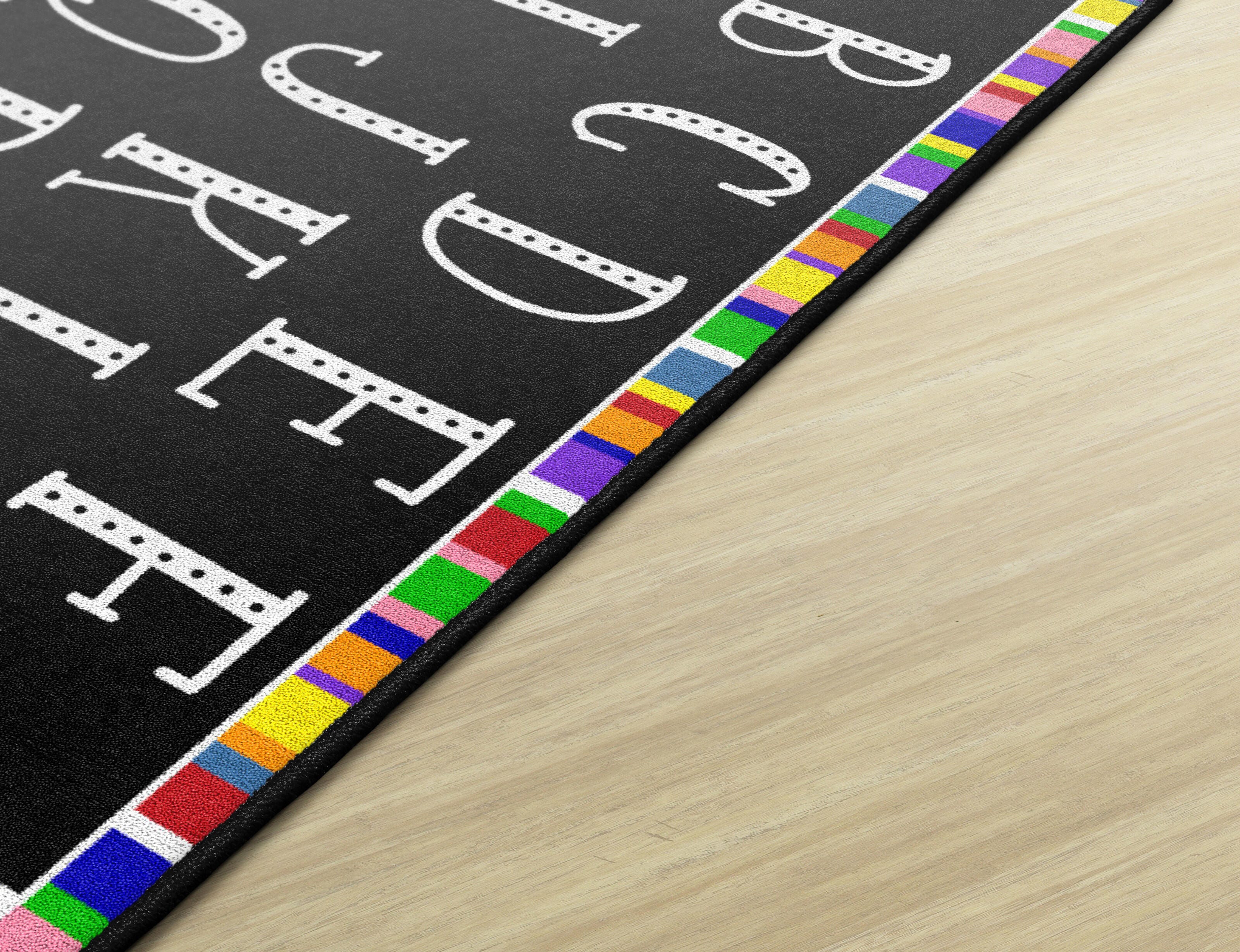 Bring a modern vibe to any classroom, preschool, or playroom with this fun alphabet carpet. Featuring uppercase letters on a black background with a rainbow border, this carpet is perfect for both younger and older children looking to master letter recognition or perhaps even just a fun pop of color. This educational carpet has a durable and sturdy backing to maintain its appearance in high-traffic areas. Rectangle rug is available in several sizes to best match your space. Please select the correct size for your space when ordering.